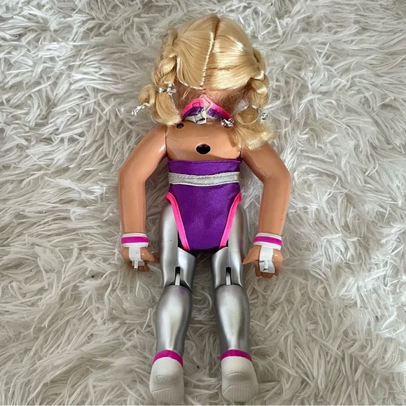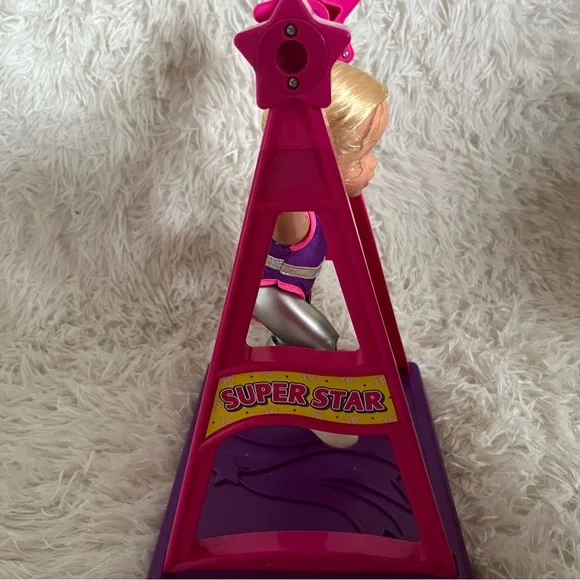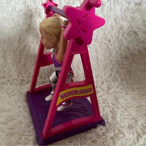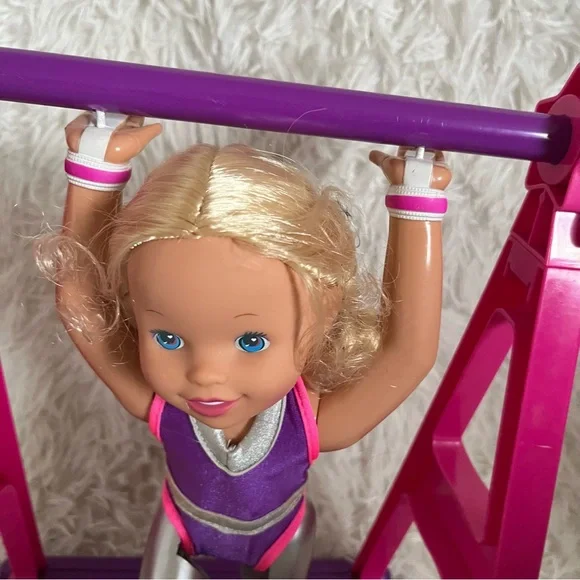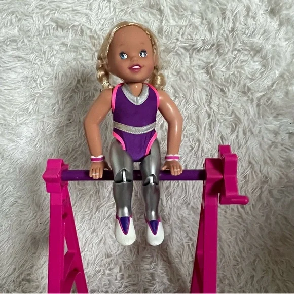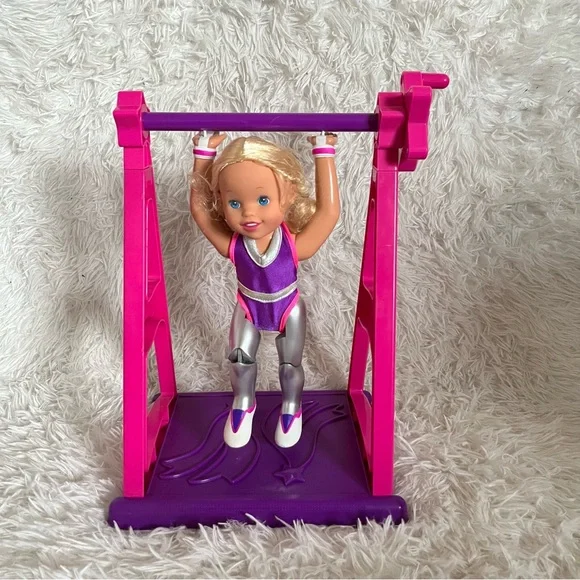 Super Star Susie Vintage 1999 Toy Biz Gymnastics Action Doll 12"ITEM NO. 33385/33386SUPER STAR SUSIE™Super Star Susie comes with her very own Super Star High bar and a built in Floor Exercise Mat. She has long blond hair in pigtail braids. She wears a removable gymnastic leotard.• 12´ action doll• Place Susie on her high bar, turn the handle and you´ll have Susie making exciting flips and moves• Susie is equipped with special hand guards and performance shoes• Remove Susie from her high bar and you can make her do fun floor routines• Pose-able action movements that you control like splits• Fun inspirational play• No batteries requiredAges 3 and UpVintage from 1999 Toy Biz, creator of Marvel LegendsUsed condition, has been played with, still functional Does not include boxDoes not include original gold medalDoes not include original training bar