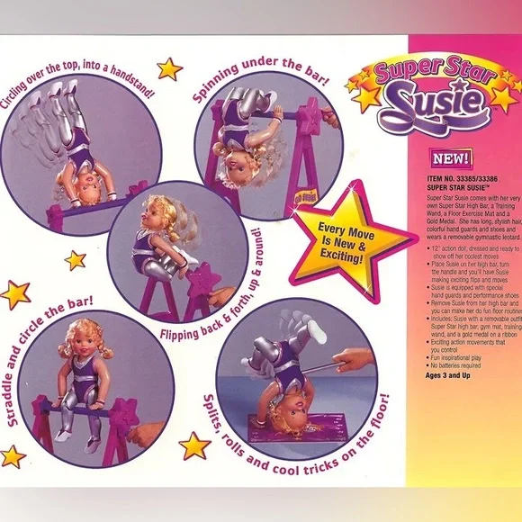 Super Star Susie Vintage 1999 Toy Biz Gymnastics Action Doll 12"ITEM NO. 33385/33386SUPER STAR SUSIE™Super Star Susie comes with her very own Super Star High bar and a built in...