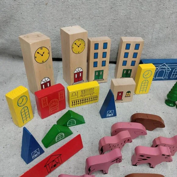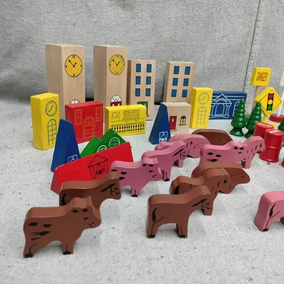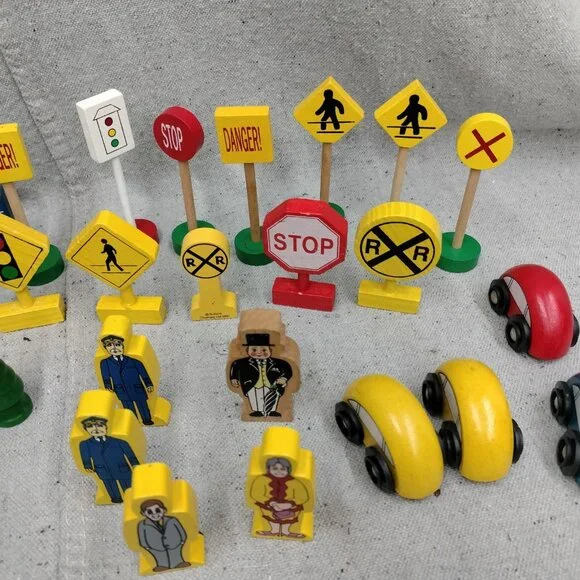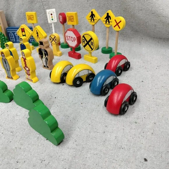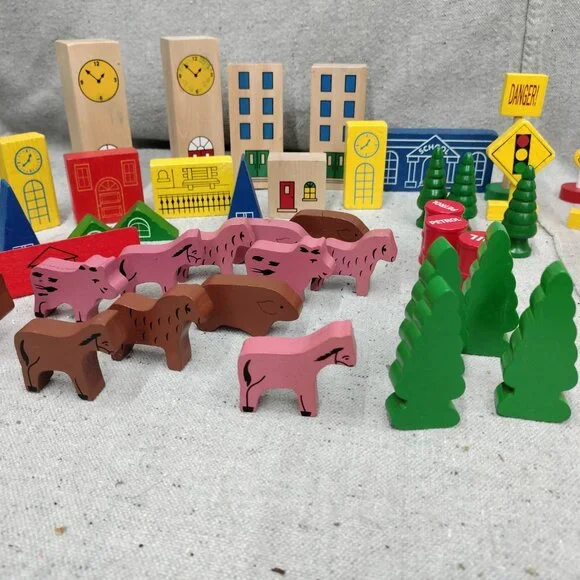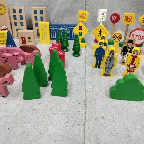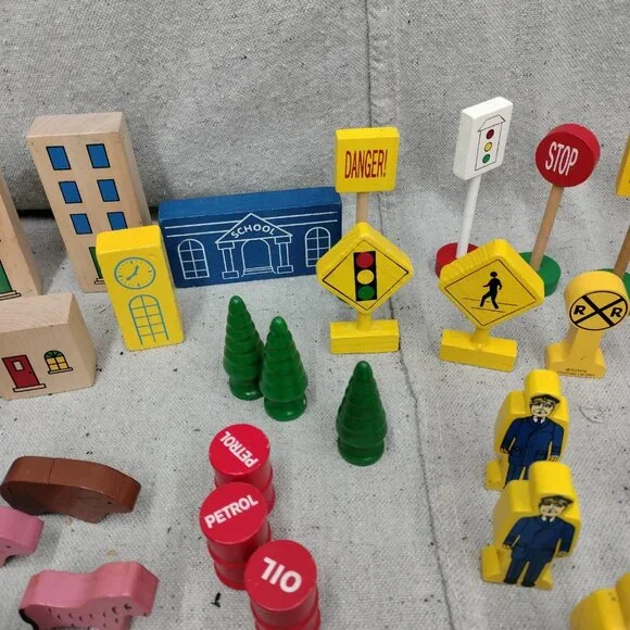 Lot of 63 Thomas & Friends Wooden Train Accessories including Trees Signs, Buildings, Animals, Cars, Barrels, and People.Please see all photos for condition details. There may be marks and scuffs on some pieces.
