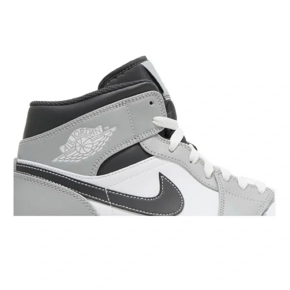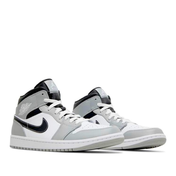 The Air Jordan 1 Mid ´Light Smoke Grey´ features an understated palette entirely devoid of color. The mid-top makes use of a smooth leather upper that combines a white base with light grey overlays at the forefoot and heel.Contrasting hits of black settle on the mid-cut collar and signature Swoosh, the latter accented with contrast white stitching. Additional branding hits take the form of a Jumpman icon on the woven tongue tag and a retro Wings logo on the lateral ankle. Anchoring the sneaker is a durable rubber cupsole with an Air-sole heel unit encapsulated in lightweight polyurethane.