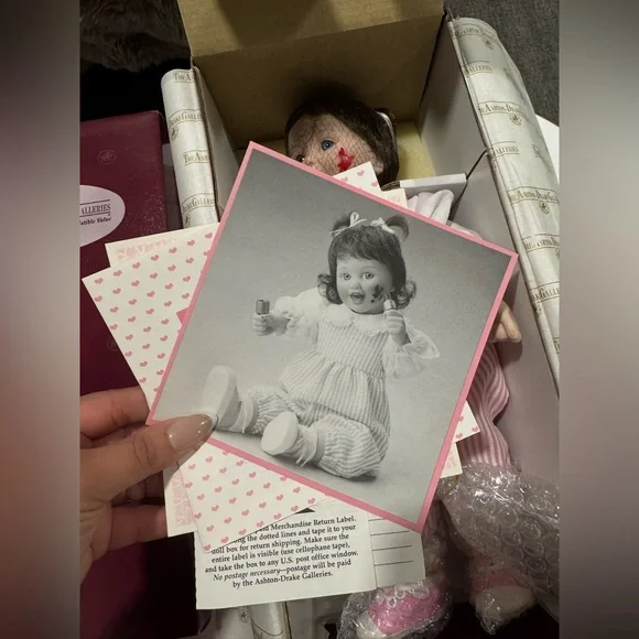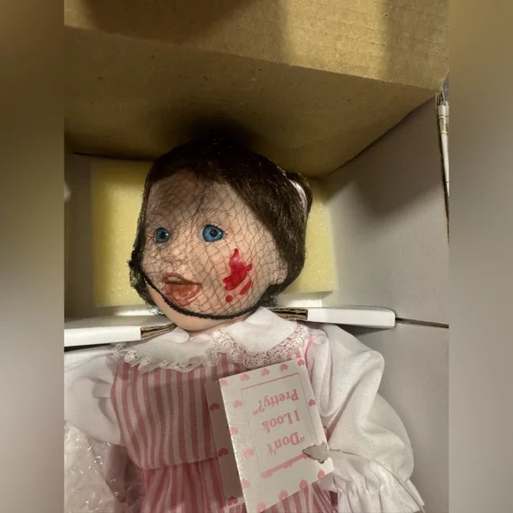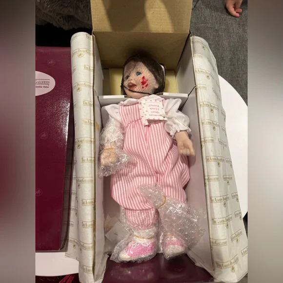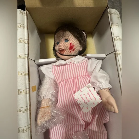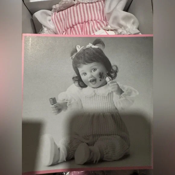 This charming doll features a vintage-inspired pink and white striped outfit with delicate lace and ruffle details. It comes with a protective display stand, making it a perfect...
