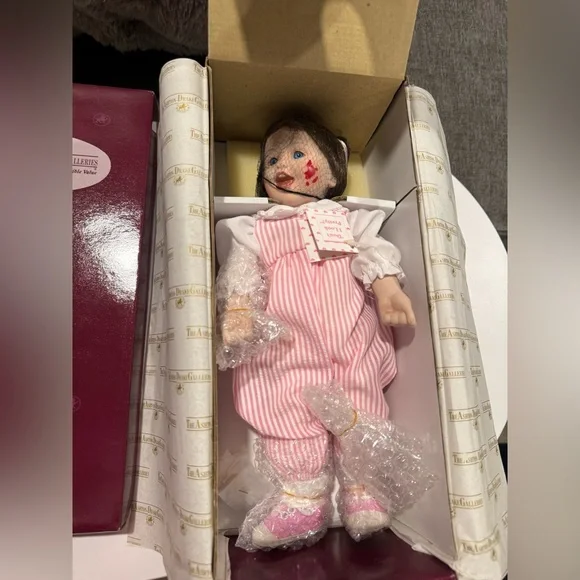 This charming doll features a vintage-inspired pink and white striped outfit with delicate lace and ruffle details. It comes with a protective display stand, making it a perfect addition to any doll collection. The doll´s elegant design and coordinated colors make it a standout piece in the Dolls & Accessories category.