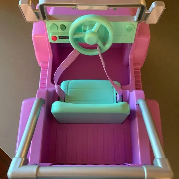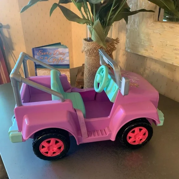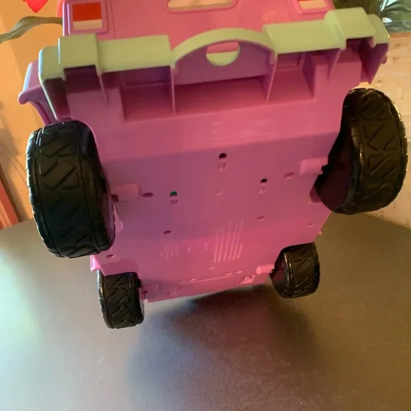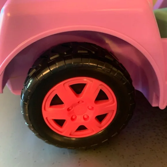 WORKING HEADLIGHTS and RADIO. BLACK tires and PINK wheel covers and has seat belt! 15.5 inches long, 9 inches tall with roll bars and 9.5 inches wide. EXCELLENT CONDITION and clean.