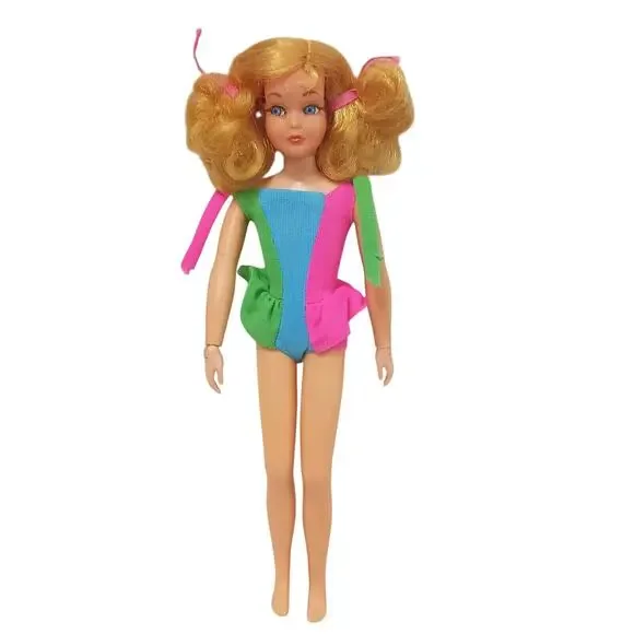 Living Skipper Doll 1969 Mattel Golden Blonde Swimsuit Beautiful HAIR ponytails Rooted Long EYELASHES Blue EyesThis beautiful Living Barbie doll from 1969 is a must-have for any collector or fan of vintage dolls. With her golden blonde hair and stunning blue eyes, she is sure to turn heads. The doll comes with a bathing suit and features wavy curly hair in pigtails. She has as a light complexion and Blue Eyes, Strawberry Golden Blonde hair.Includes: Original Bathing Suit and 2 Matching Hair RibbonsThis original Mattel Barbie doll is stamped 1969 Matttel on the back and includes information about the year of manufacture and the country of origin.VINTAGE, she is in lovely condition, light normal age wear 1969, beautifully kept, crisp and clean. All limbs move. Head turns, waist twists.**(Pages from the Barbie catalog are not included. They are just as a fun example of her original outfit.)**Your lovely item will be packaged carefully and shipped out quickly.