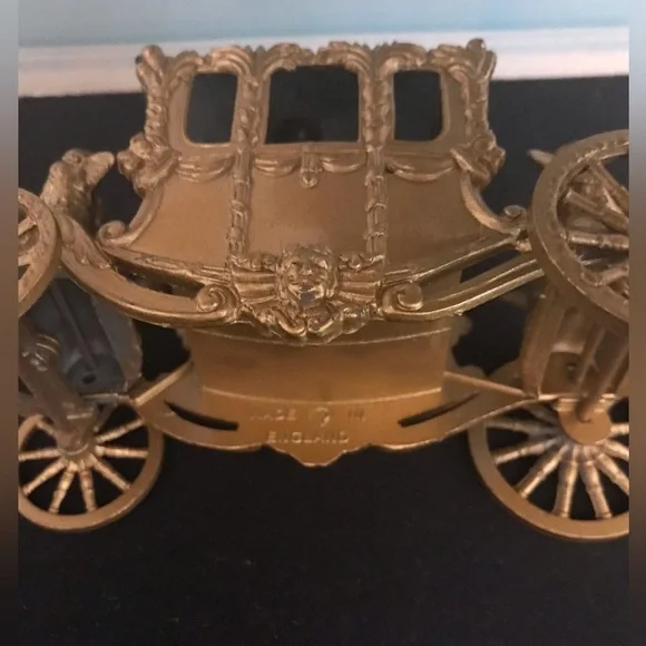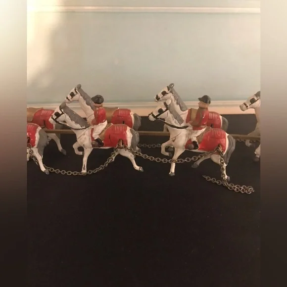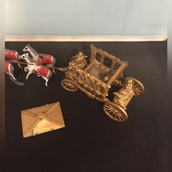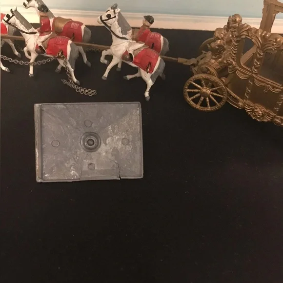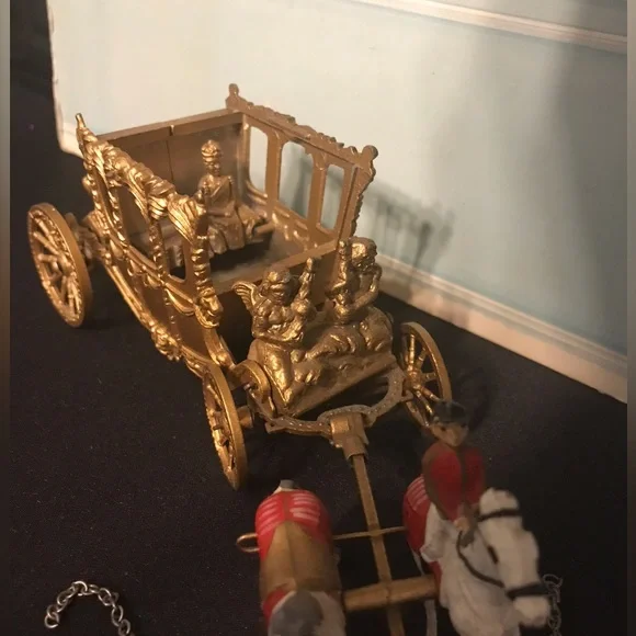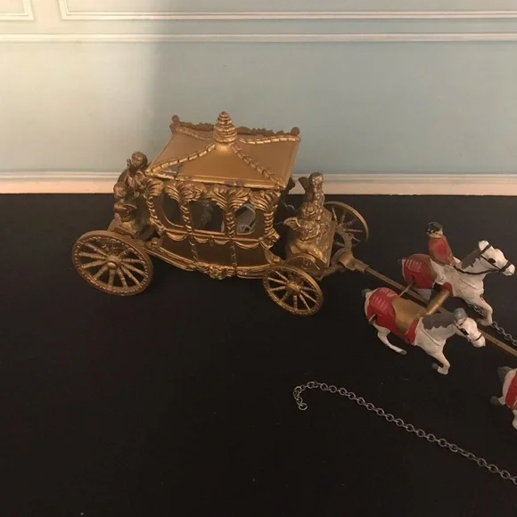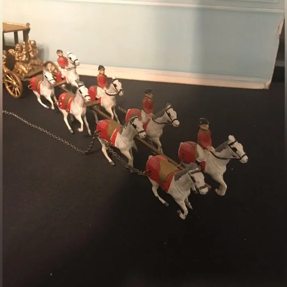 Lesney 1950’s Queen Elizabeth Coronation Coach Carriage Horses and riders.Nice vintage condition. Minor issues. Chains detached from horses to carriage. Easy fix. Carriage top has small mars, see pics for best description.Measures approximately 15 1/4" long x 2 1/4" wide x 3.5" tall. Amazing, hard to find piece!