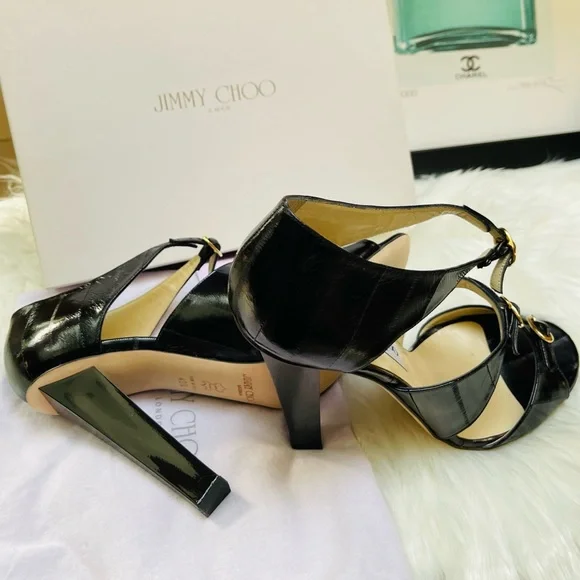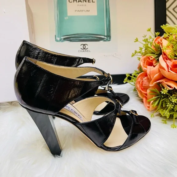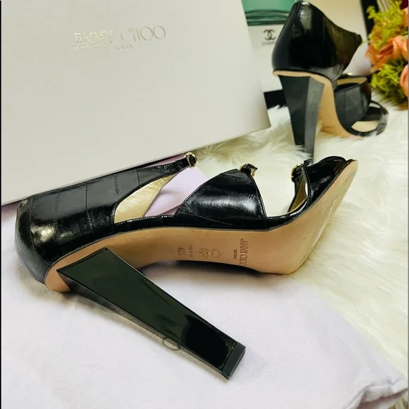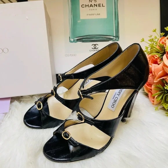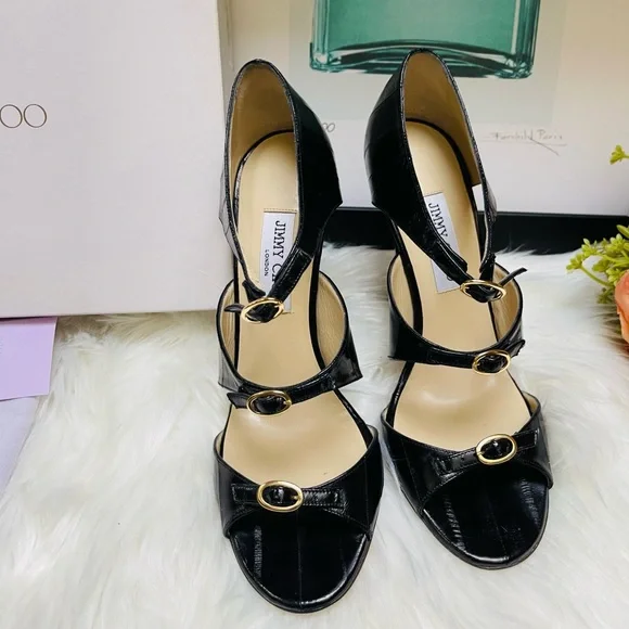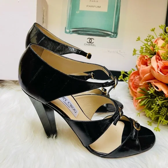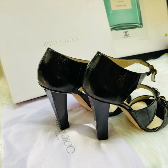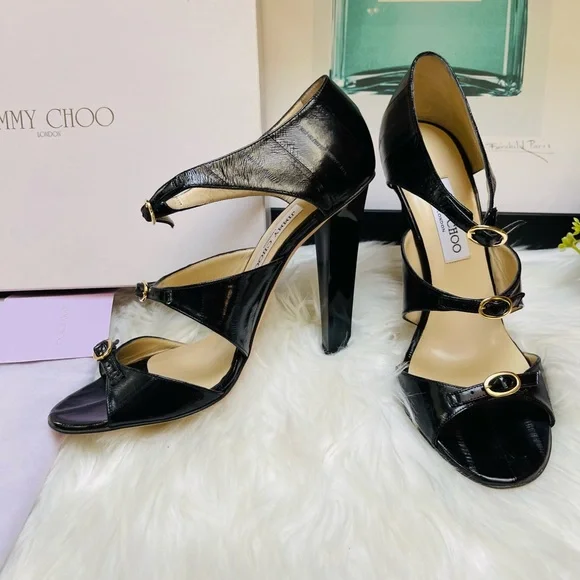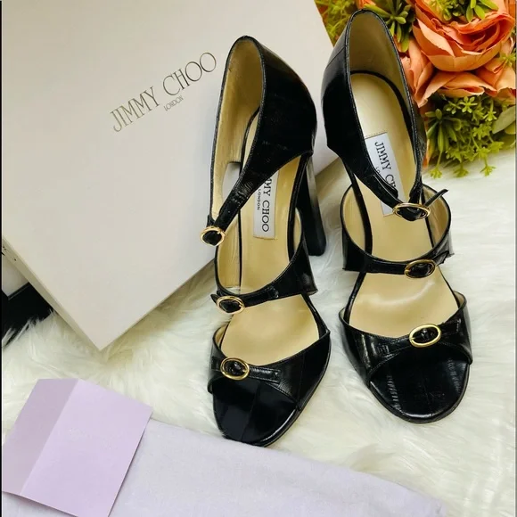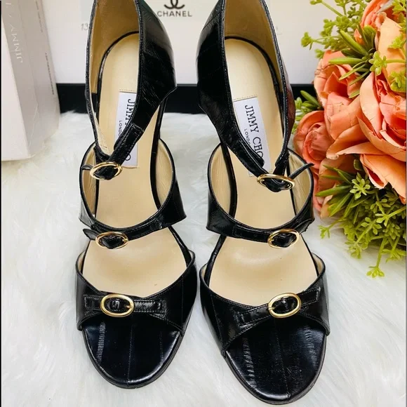 Gorgeous Jimmy Choo black leather heels with3 straps with silver buckles. Leather insoles and soles. Approximately 4.5” inches heel. Like new condition. Comes with dust bag and shoe box. Size Eu 40.5Made in Italy.