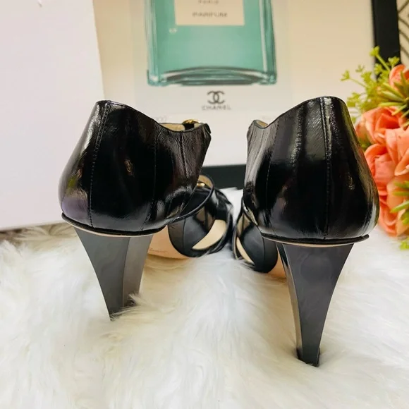Gorgeous Jimmy Choo black leather heels with3 straps with silver buckles. Leather insoles and soles. Approximately 4.5” inches heel. Like new condition. Comes with dust bag and...