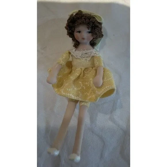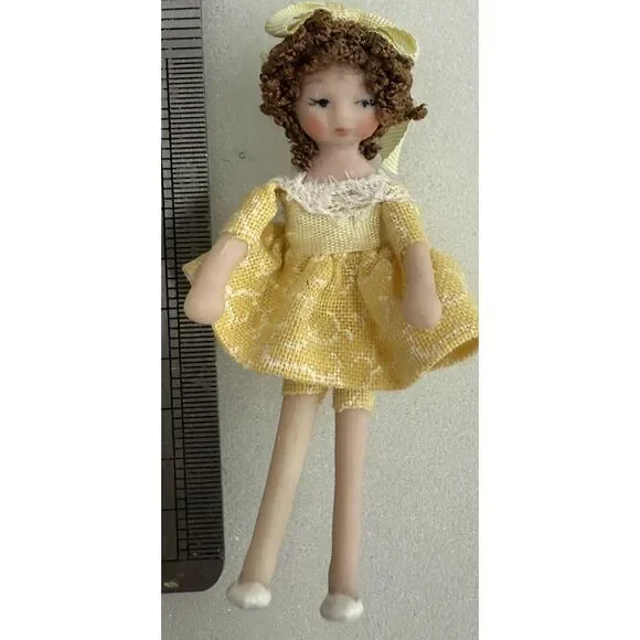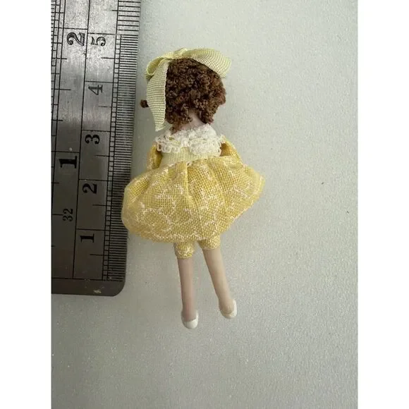 Vintage Ethel Hicks handmade miniature doll from the Ragdoll Series. This original 1.5" doll features red curly hair, blue eyes, and a light complexion. The doll is made of metal and fabric, and comes with an outfit. Produced in the 1990s, this girl doll is a unique addition to any miniature doll collection.