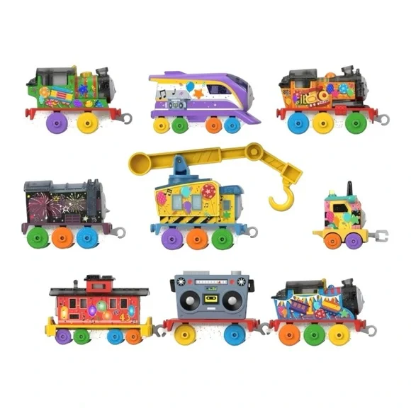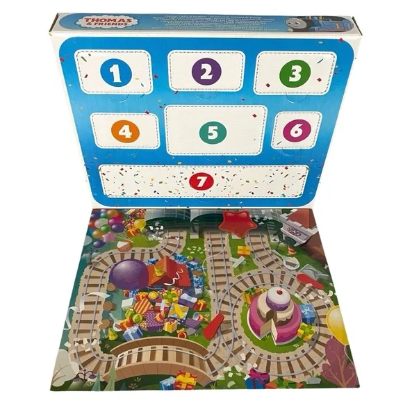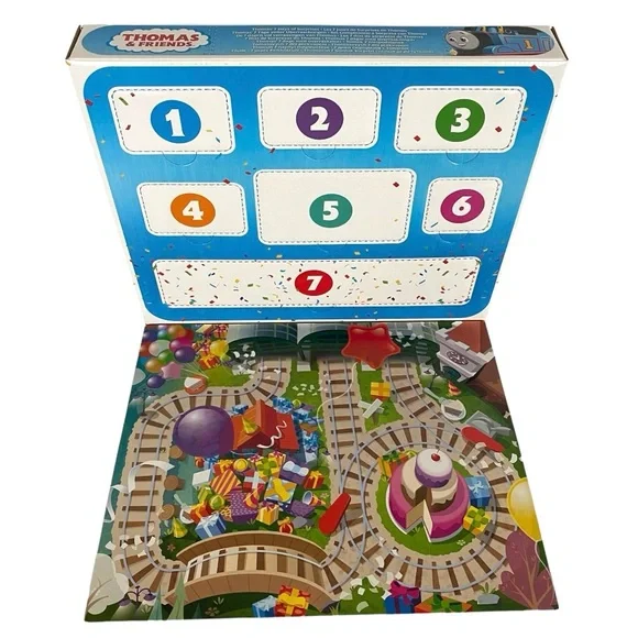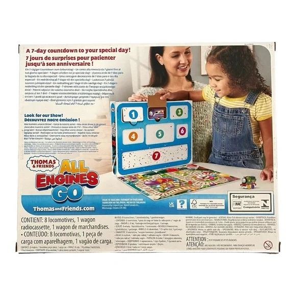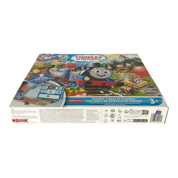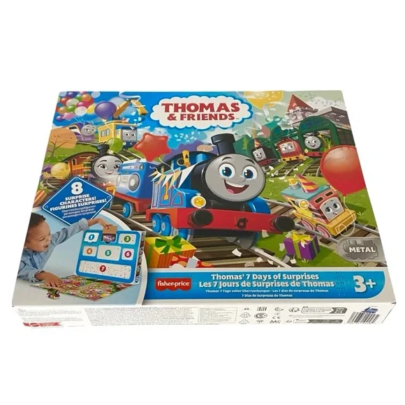 Thomas and Friends 7 Days of Surprises.Toy Trains.New in Box.Set includes:Thomas.Percy.Nia.Sandy the Rail Speeder.Brake Car Bruno..Kana and Carly the Crane.Plus 1 cargo car and 1 boom box cargo piece.Celebrate special occasions.Countdown to fun.Kids can open a window every day for 7 days to discover a mystery toy hiding inside.Diecast metal vehicles.Ages 3 Years and Up.Warning! Small Parts. Choking Hazard. Not for children under 36 months.Ships fast with care from a smoke-free, pet-free environment.Unit#A3824N