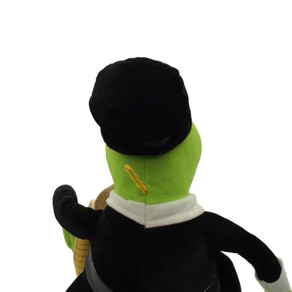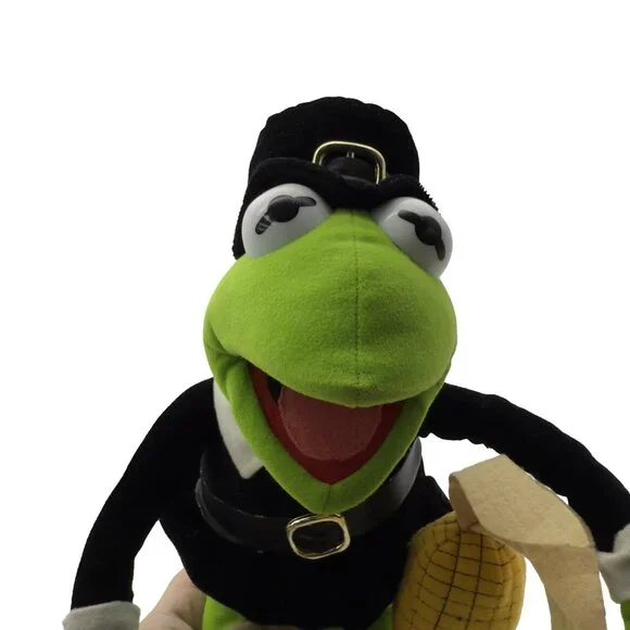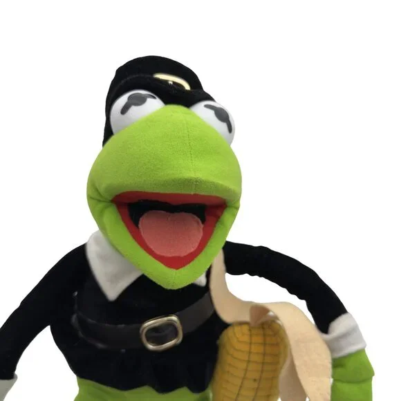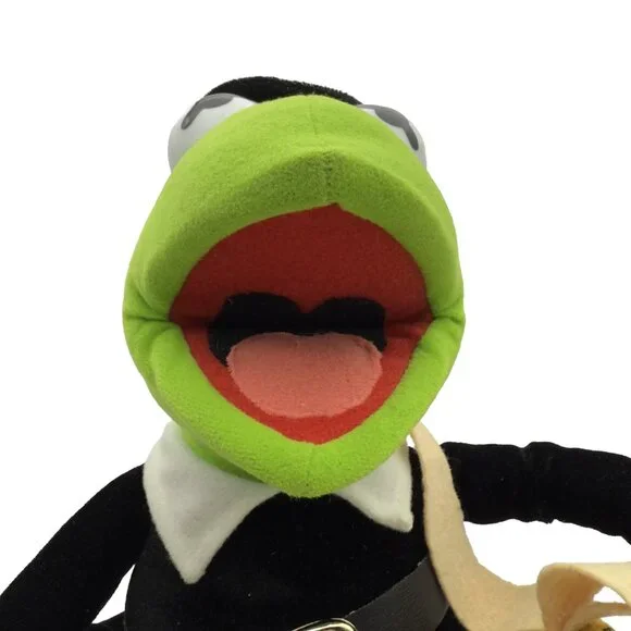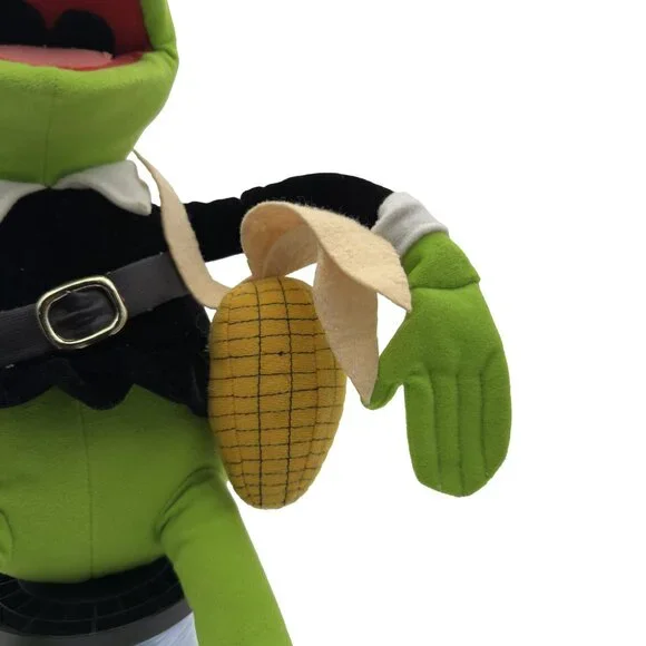 • Character & Maker: Plush puppet of Kermit the Frog styled as “Chelsea,” created by Jim Henson Company• Size & Material: Approximately 20″ tall, crafted from soft green felt and black velour outfit, accented with white collar and felt corn accessory• Design & Features: Articulated mouth opens; wearing black velour jacket with belt and matching cap; removable felt corn ear accessory for playful display• Condition: Gently used with light surface wear on felt (minor discoloration on corn accessory); seams intact and vibrant colors• Origin & Labeling: Tag reads “Chelsea MA 02150 TM & © Henson MADE IN CHINA” and fiber content label indicating synthetic fill• Care & Storage: Surface clean only; stored in smoke‑ and pet‑free environmentStyling TipsAn adorable display piece—a perfect accent for a media room shelf, Muppet collection, or children’s puppet story time. Its articulated mouth and accessories make it great for play or whimsical décor.