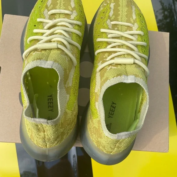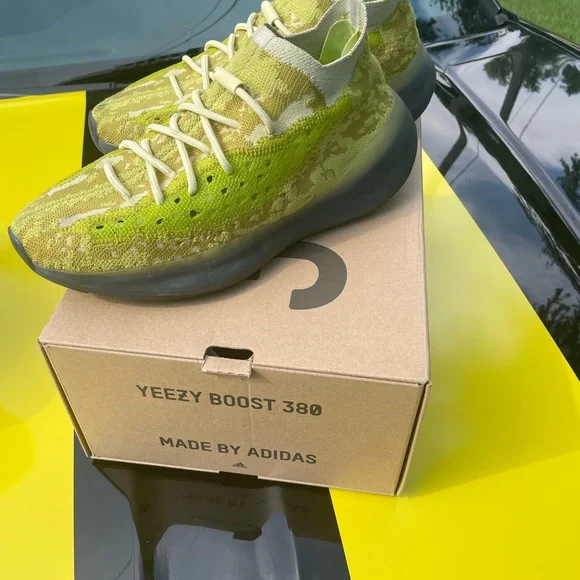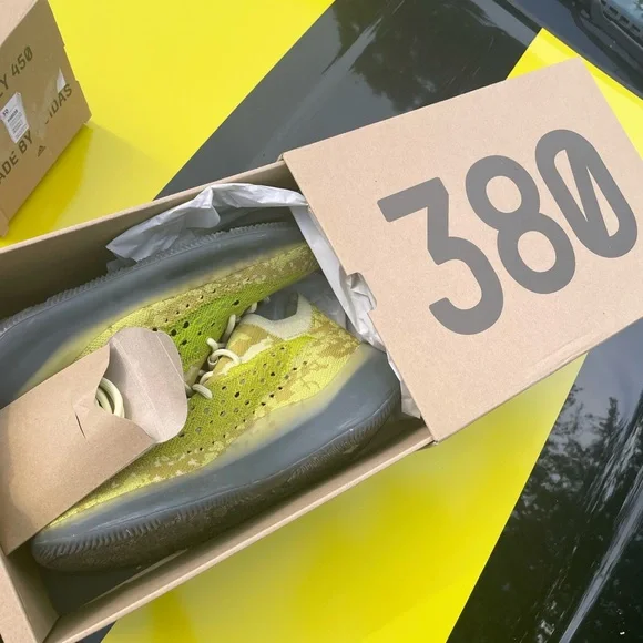 The adidas Yeezy Boost 380 “Hylte Glow” is the glow-in-the-dark version of the North America exclusive colorway that was released in December 2020 by adidas. The “Hylte Glow” is nicknamed after the shades of light and dark yellow semi-perforated Primeknit material used in the intricate pattern on the upper of the shoe.