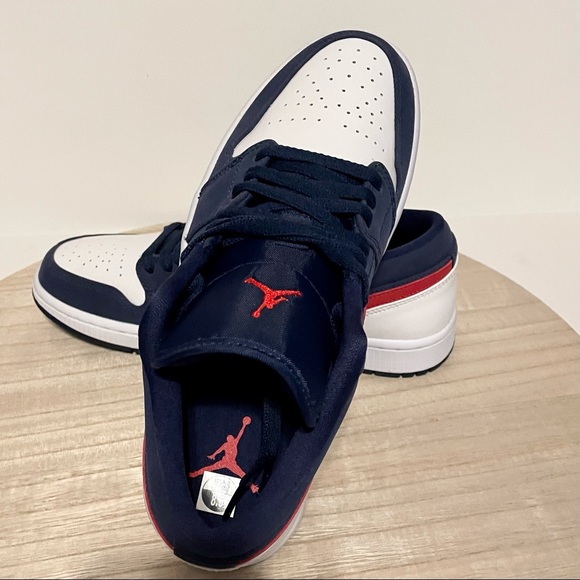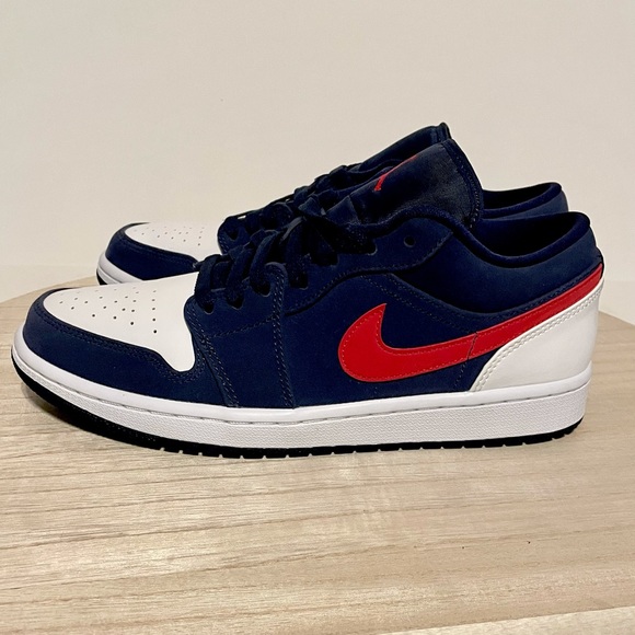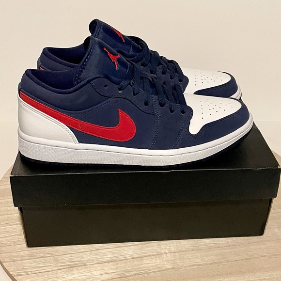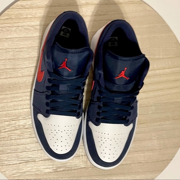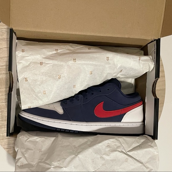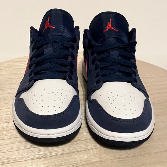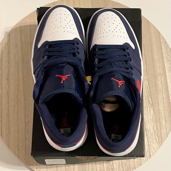 Brand new in box and authentic!! Nike Jordan 1 Low USA IN Midnight Navy and University Red. Size 8.5 in Men’s. Brand New Deadstock Never Worn