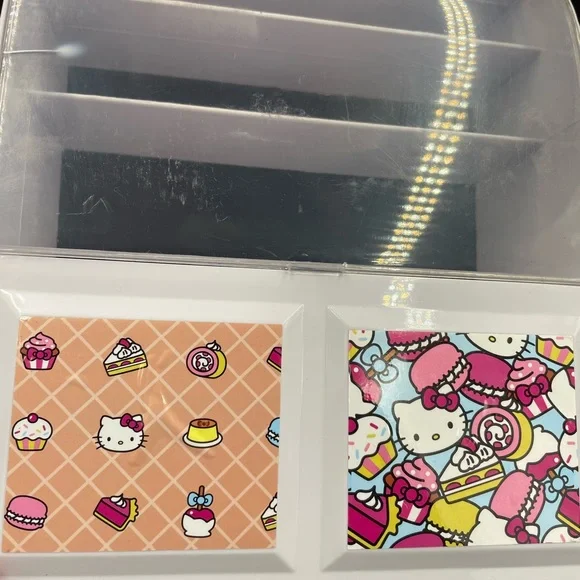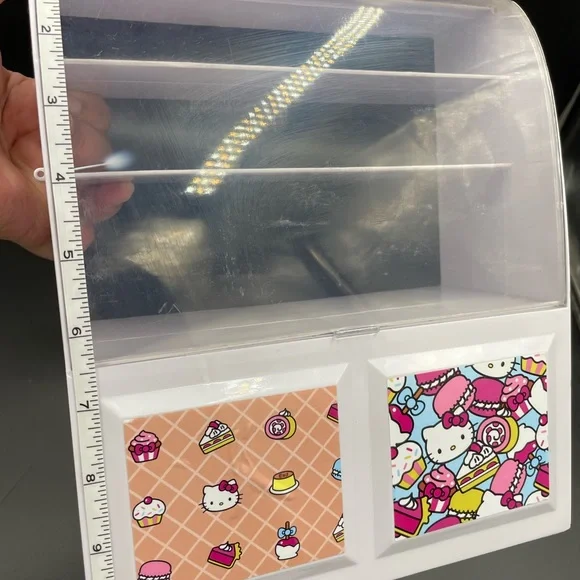 Please read description: Getting rid of personal collection no longer have room for this super adorable ( I’ve noticed a small crack on the corner what looks like a surface crack doesn’t affect the overall functionality of the display case still lifts up if needed) brand: Hello Kitty Display miniature figurine display case measurements: 10.5 inch X 10.5 inch
