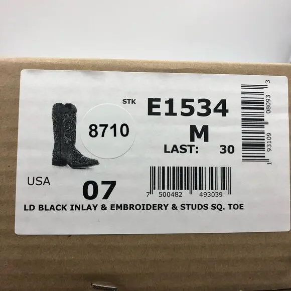 Corral Womens Inlay & Embroidery & Studs Square Toe Black Size 7 MBrand : CorralStyle :Inlay & Embroidery & Studs BootsColor : BlackSize : 7 MSku No :8710Condition ; New With BoxFull-grain leatherPull tabsSquare toeLeather liningStudded embellishmentsBlack inlay designCushion footbedLeather outsoleStockman heelStyle: E1534
