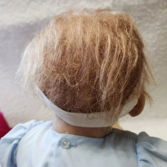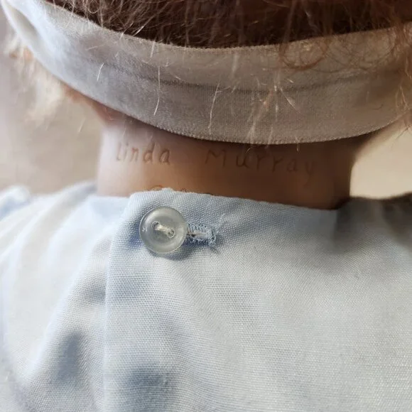 This doll is in very good condition, but her hair could use a good combing.Her eyes are brown. I didn´t see any spots or stains on her.She´s been mostly just displayed.She is approximately 21.5 inches and weighs about 4.5 pounds.She is very lifelike!The back of her neck says "Linday Murray" and "ADG".ADG stands for Ashton Drake Galleries.She still smells like baby powder like she did when I opened her.She´s mostly been displayed.