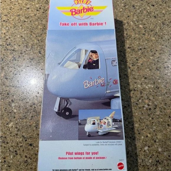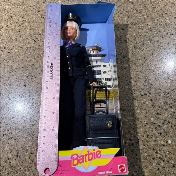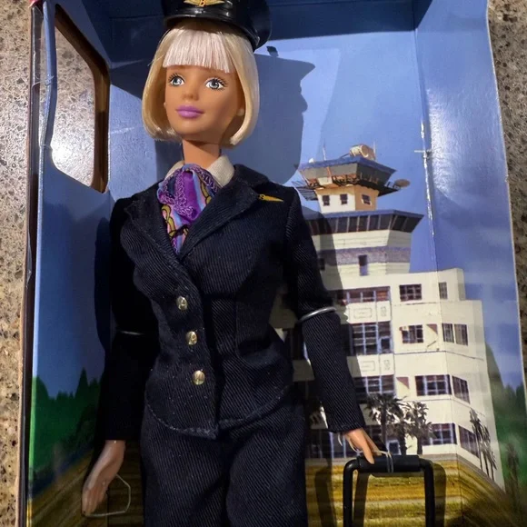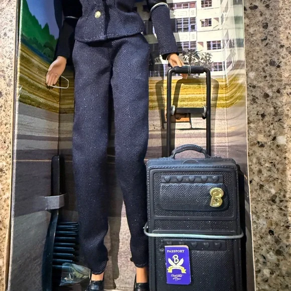 Barbie doll dressed as a pilot. Features a sleek black uniform and matching hat. Comes with a rolling suitcase accessory. New in box, but the box is damaged. Special edition.
