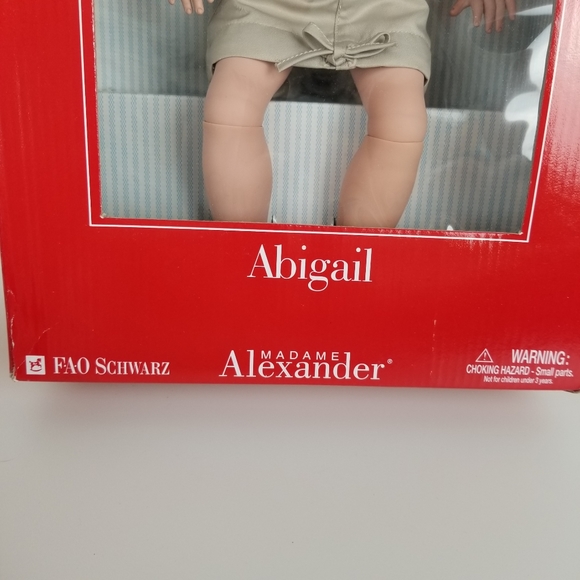 NIB Fao Schwarz Madame Alexander 14" Abigail Doll. Doll is wearing clothing along with Tommy sandals and is from 2000. She is a jointed doll.Doll has never been removed from box but box does have a few dings on it.