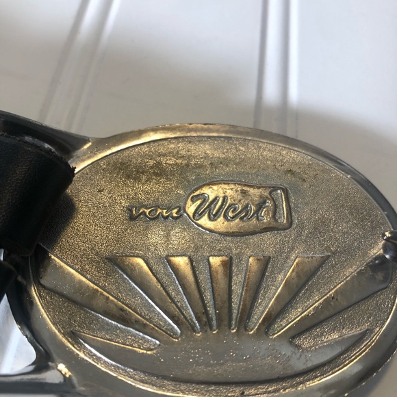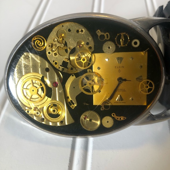 Vintage belt buckle with cogs, steampunk vibe. Black leather belt is made by T. Staley in Las Cruces New Mexico and is very long, approx 55”. More measurements in pictures....