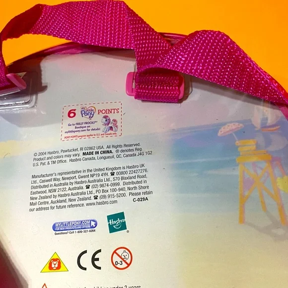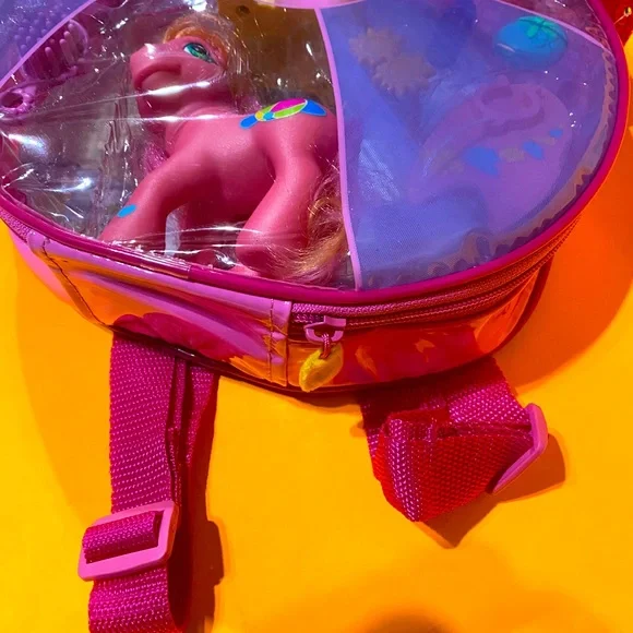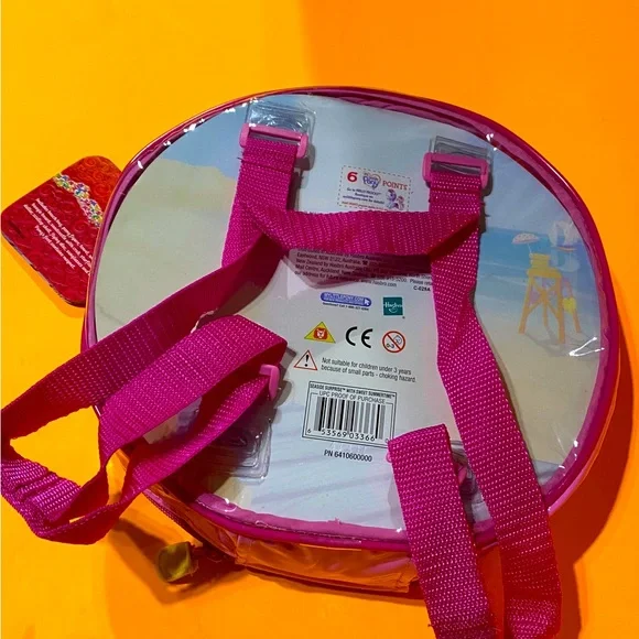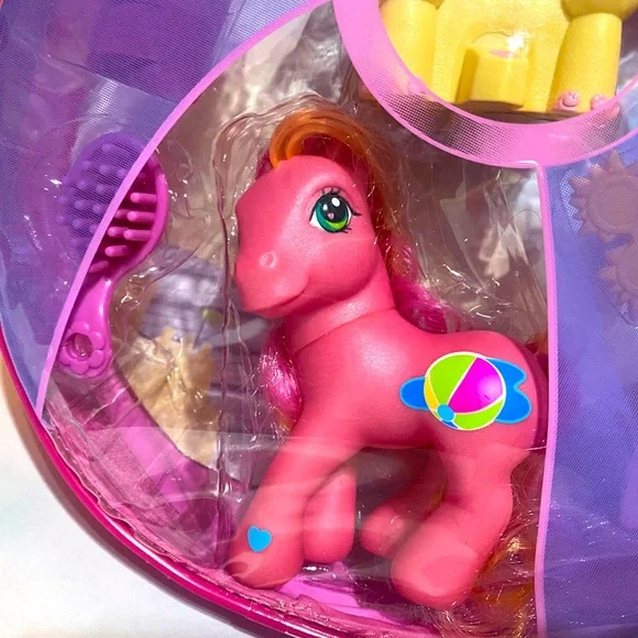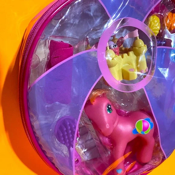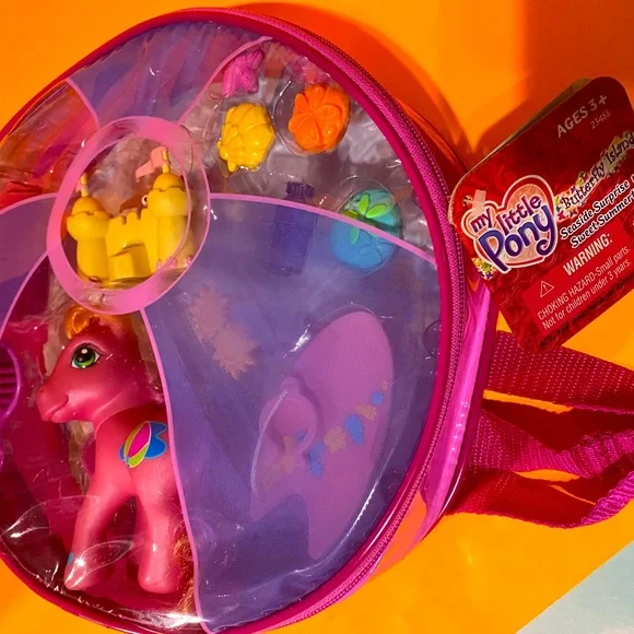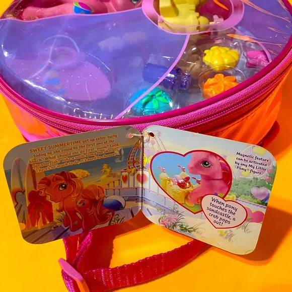 My Little Pony G3NWT Vintage 2004 Butterfly Island Seaside Surprise With Sweet Summertime Magnetic Playset In Zippered Plastic Case With Pink Adjustable BackPack Straps, Touch The Sand Castle With The Ponies Foot And The Crab Pops Up, Includes Zipper Plastic Carry Case With Adjustable Backpack Straps Pink Seaside Surprise Pony w/Orange/Pink Hair, Beachball Symbol, Pink Brush, Pink Towel, Pink Surfboard w/ Flowers & Attaches to Foot, Yellow Sunglasses, Sandcastle With Crab, Purple Water Bottle, Yellow Clam She’ll, Pink Starfish, (2) Sand Dollars Size 10”Diameter 3” Wide Straps Are Adjustable RARE NWT