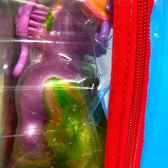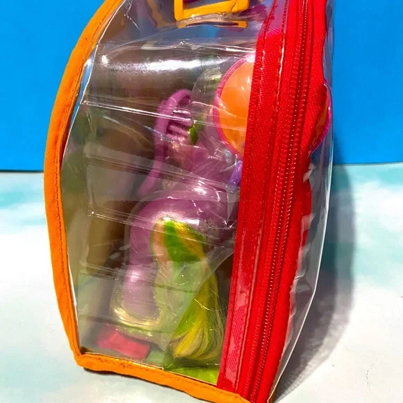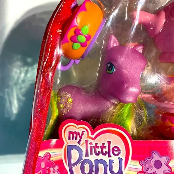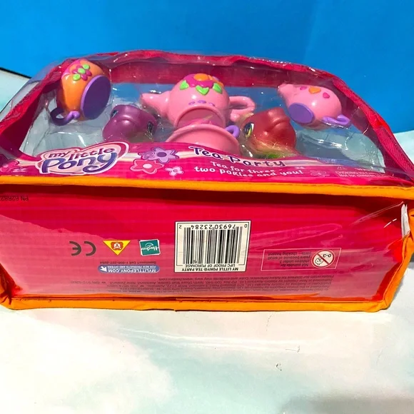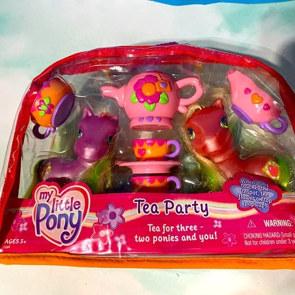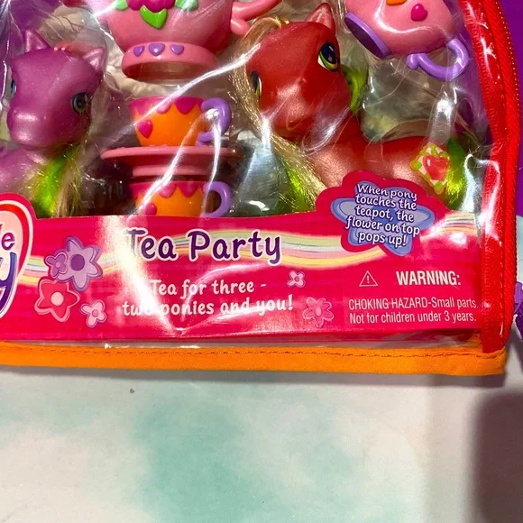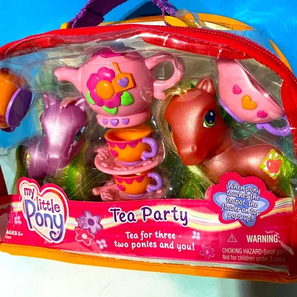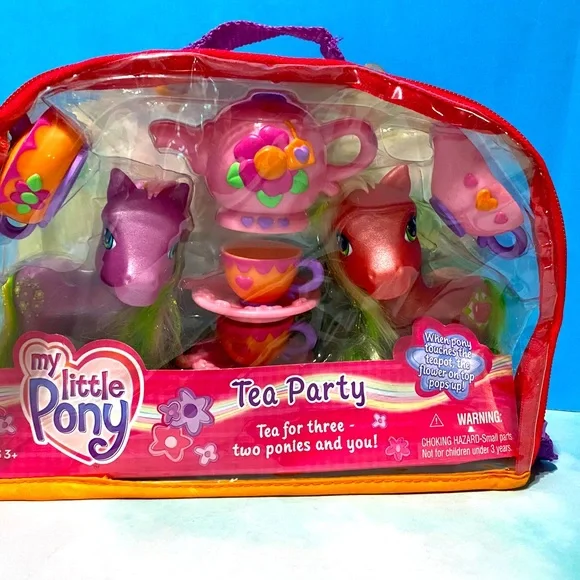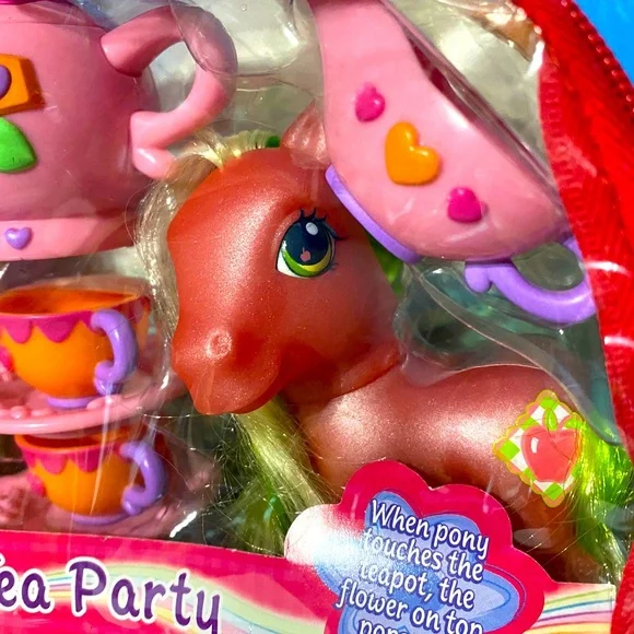 My Little Pony G3 NWT Vintage 2003 CollectableTea Party Megnetic Playset for 3 by Hasbro When The Pony Touches The Teapot The Flower On The Top Pops Up, Includes Applejack & Spring Fever Ponies, Teapot, Sugar Bowl, Creamer, 3 Teacups with Saucers, 2 Brushes & Placemat Set Is Complete in Vinyl Zipper. Carry Case w/ Handle NEW CONDITION Carry Case Size 10”x7”x4”