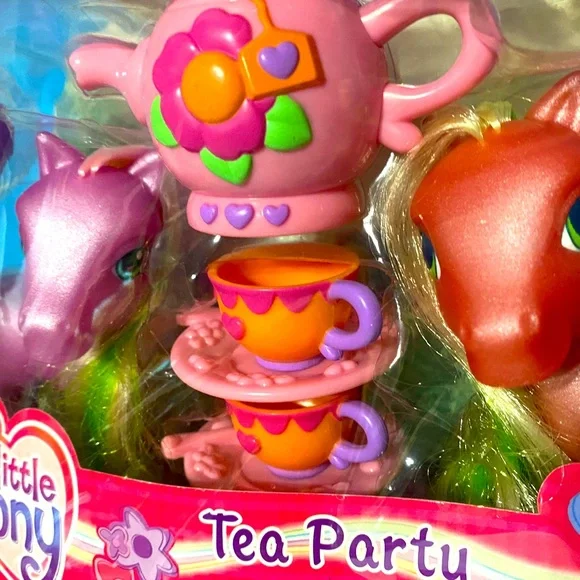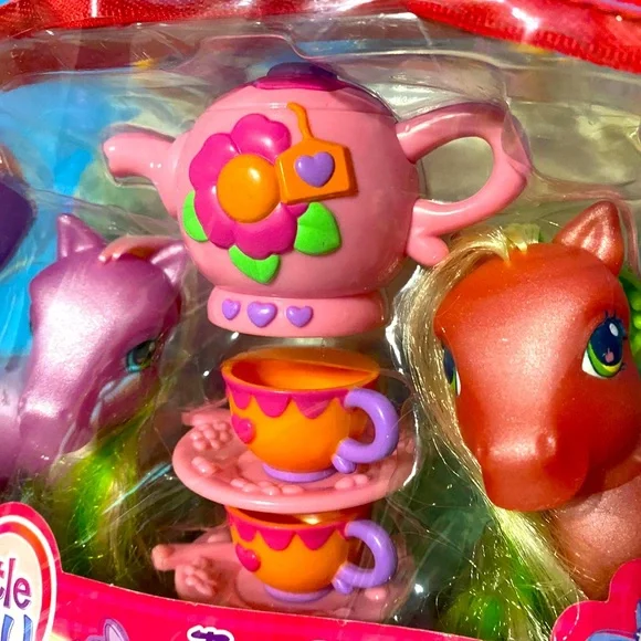 My Little Pony G3 NWT Vintage 2003 CollectableTea Party Megnetic Playset for 3 by Hasbro When The Pony Touches The Teapot The Flower On The Top Pops Up, Includes Applejack &...