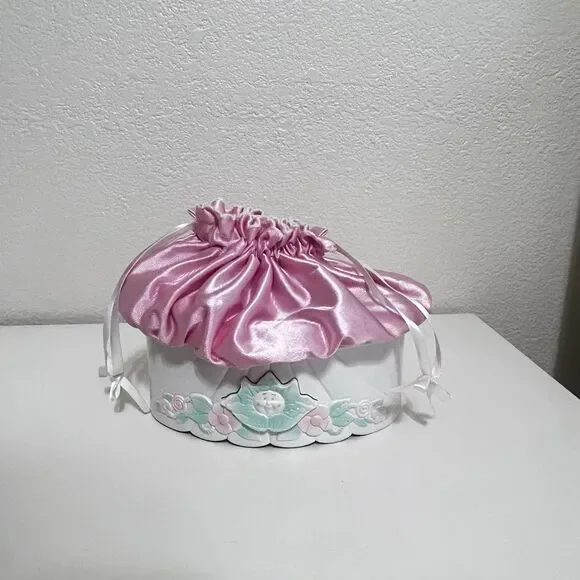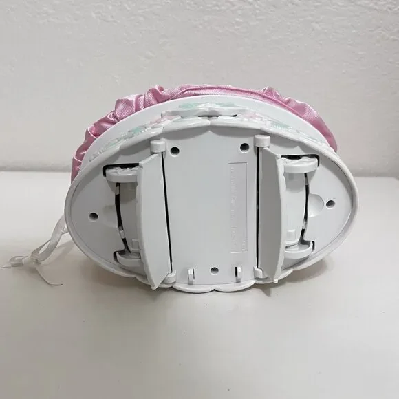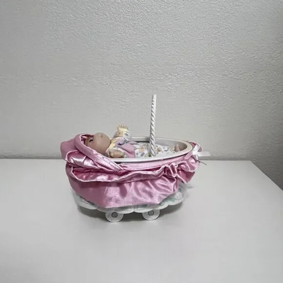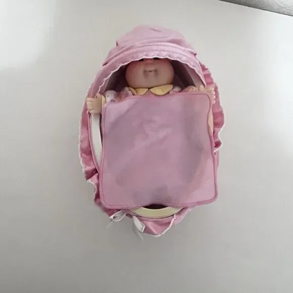 Vintage Cabbage Patch Kids Doll Magic Nursery Cradle Carriage Pink Set 1998. Adorable little set that can convert from a bed to a cradle to a carriage and to a purse. Includes the cradle/carriage, baby doll, baby blanket, and four accessories for the doll (rabbit toy, baby bottle, baby brush, and wrist toy). Vintage, has been used and stored for many years. There is a lot of yellowing to the plastic in places, scratches, and marks to the plastic. The elastic on the top satin part is pretty stiff and the rubber band in the dolls hair has come undone. An adorable set with a ton of life left, but is not perfect.The doll measures approx. 5.5 inches in length.The back of the dolls head indicates 1995 and the plastic cradle is marked with 1998.4 Ways to Take Care of Baby- Start with a cozy bead for sleeping- Snap down legs for a cradle for rocking- Snap down wheels for a carriage for walking- Change it into a purse to take along- 4 play pieces and a secret storage drawer