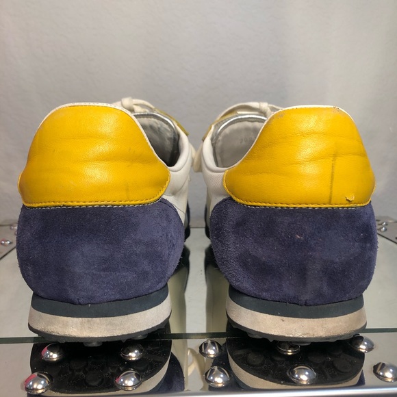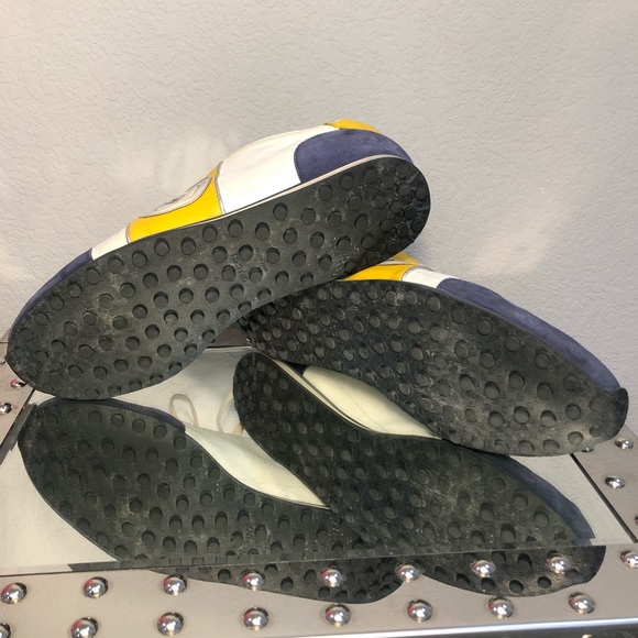 These yellow and blue sneakers have been pre-loved. Still in good condition. There is slight creasing and a few barely noticeable stains on the white part of the shoe. Also, there is a scratch and scuff on the back of one of the shoes. (Flaws pictured). Size 11 1/2.