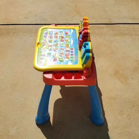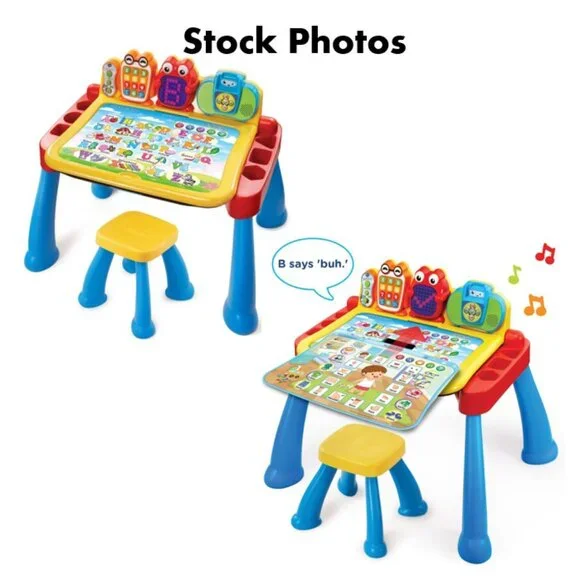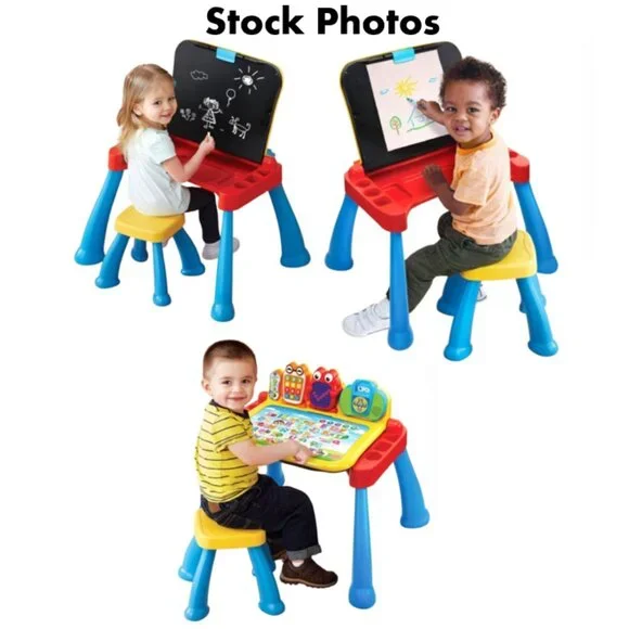 VTech Touch and Learn Activity Desk Deluxe - Red & Blue - Pre-OwnedThese were not used outside. For lighting reasons I took the pictures outside.I included a few Stock Photos to help show the design and functions of the item. The remaining pictures are pictures I took of the item.Please see the remaining pictures for a detailed visual description of the actual item you will receive.Information from website:- The Touch and Learn Activity Desk Deluxe is an interactive desk and includes five activity pages to explore that are filled with engaging content- Extend the fun with expansion packs (each sold separately) that include a wide curriculum; LED display illustrates letter and number stroke order and how to draw basic shapes- Transforms from a desk into an easel and chalkboard with storage space for art supplies to encourage play and discovery; stool included- For more ways to play, pretend to make a call on the toy telephone or listen to fun tunes on the music player; Progress Button reports on child´s progress- Features 100+ vocabulary words, 20+ activities and 20+ songs and melodies; requires 4 AA batteries (not included); intended for ages 2 years and upFast shipper. I love bundles, however due to the weight of this item this can not be bundled.If you have any questions please ask.All items come from a smoke free house.Disclaimer: Due to the many variations in monitors, phones and browsers, the color of item(s) may appear different in person.