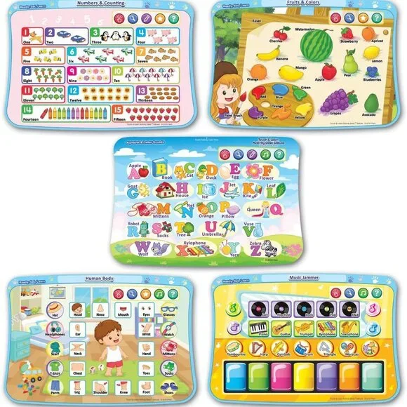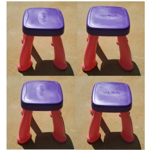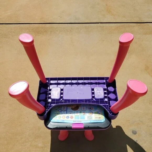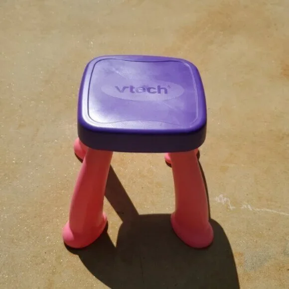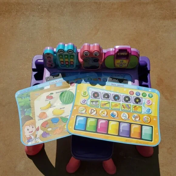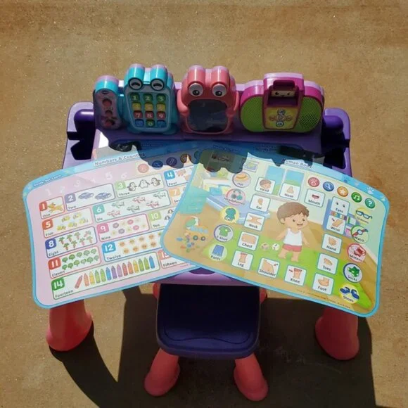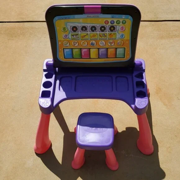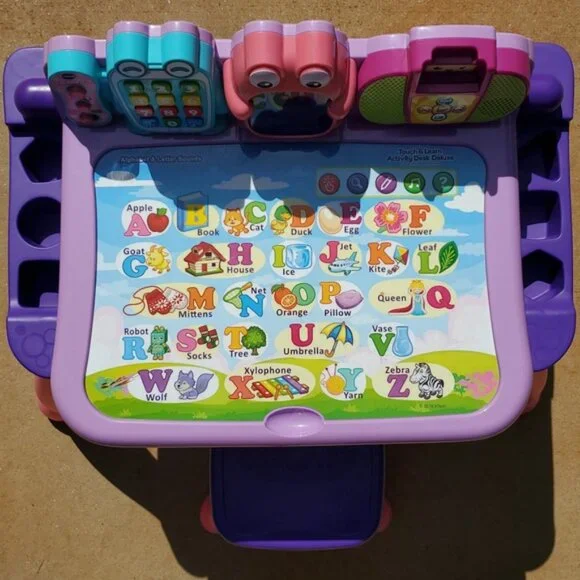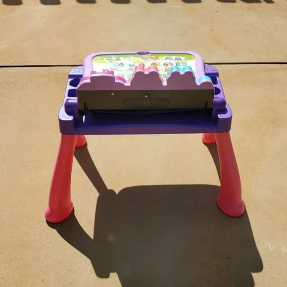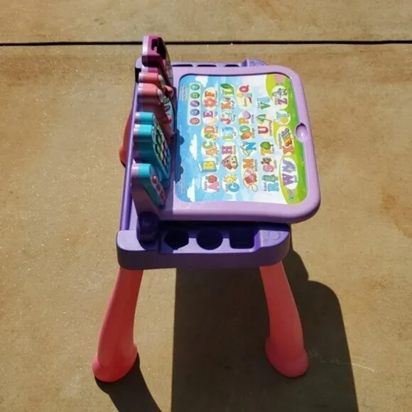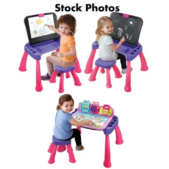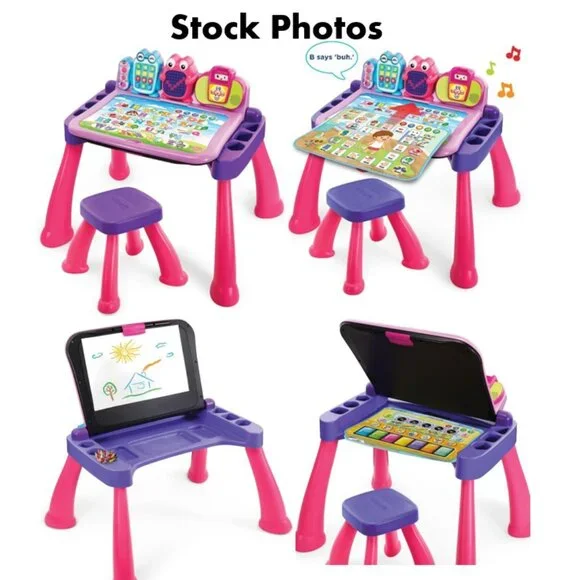 VTech Touch and Learn Activity Desk Deluxe - Pink & Purple - Pre-Owned These were not used outside.For lighting reasons I took the pictures outside.I included a few Stock Photos to help show the design and functions of the item. The remaining pictures are pictures I took of the item.Please see the remaining pictures for a detailed visual description of the actual item you will receive.Information from website:- The Touch and Learn Activity Desk Deluxe is an interactive desk and includes five activity pages to explore that are filled with engaging content- Extend the fun with expansion packs (each sold separately) that include a wide curriculum; LED display illustrates letter and number stroke order and how to draw basic shapes- Transforms from a desk into an easel and chalkboard with storage space for art supplies to encourage play and discovery; stool included- For more ways to play, pretend to make a call on the toy telephone or listen to fun tunes on the music player; Progress Button reports on child´s progress- Features 100+ vocabulary words, 20+ activities and 20+ songs and melodies; requires 4 AA batteries (not included); intended for ages 2 years and upFast shipper.I love bundles, however due to the weight of this item this can not be bundled.If you have any questions please ask.All items come from a smoke free house.Disclaimer: Due to the many variations in monitors, phones and browsers, the color of item(s) may appear different in person.