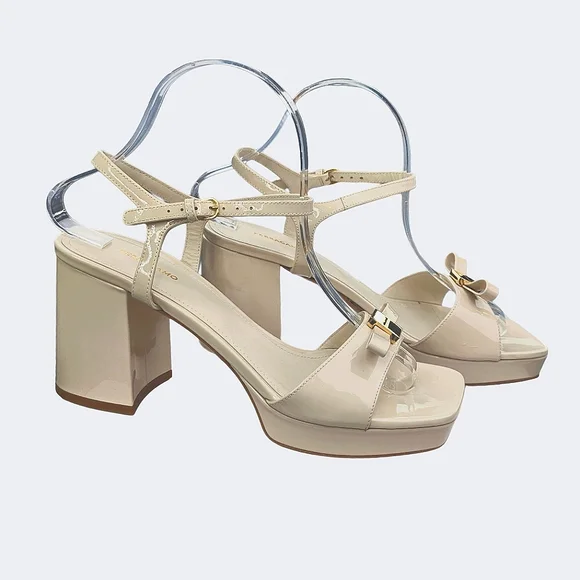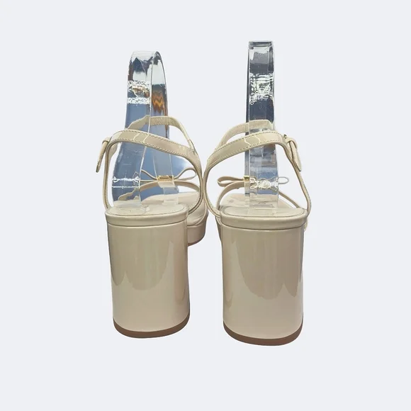 EUC. SALVATORE FERRAGAMO 75mm Off-White Patent Leather Platform Sandal.Off-White calf leather with patent finish, bow detailing, goldtone logo plaque, buckle-fastening ankle...