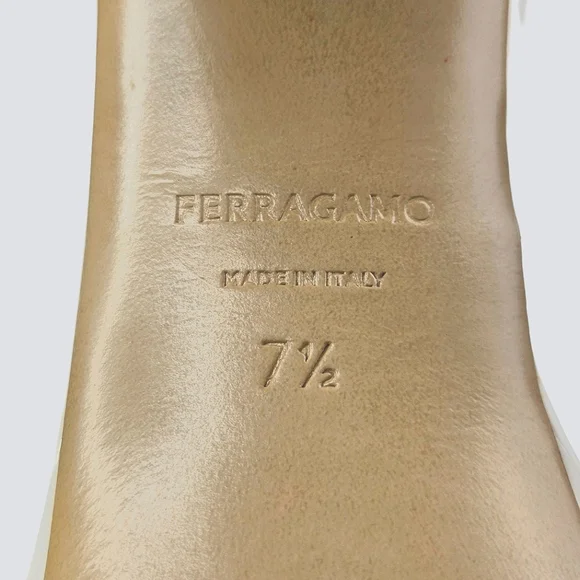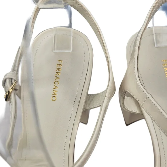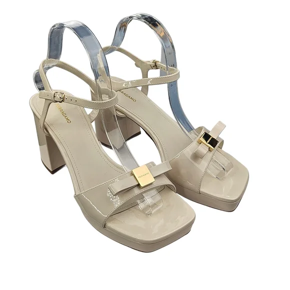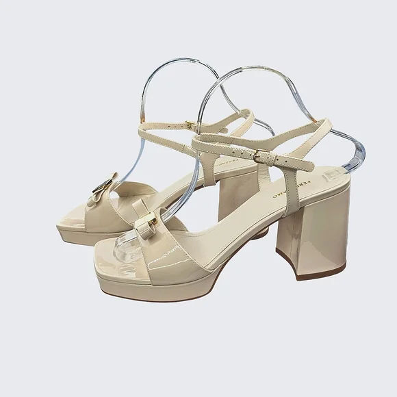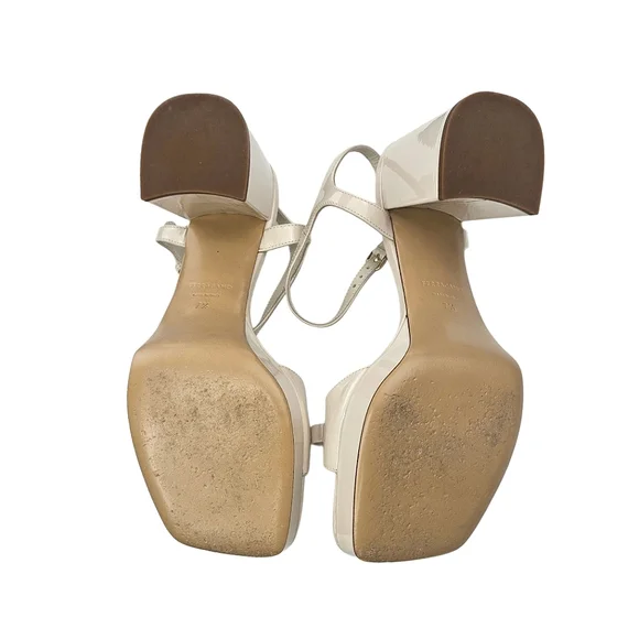 EUC. SALVATORE FERRAGAMO 75mm Off-White Patent Leather Platform Sandal.Off-White calf leather with patent finish, bow detailing, goldtone logo plaque, buckle-fastening ankle strap, square open toe, branded leather insole, platform sole, comfortable 75mm mid block heel.Heel height: 3.25" with ¾" platform.Feels like 2.5" heel.EXCELLENT USED CONDITION, only worn once. Original dust bags included. Size 7½. True to size.