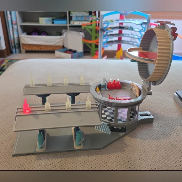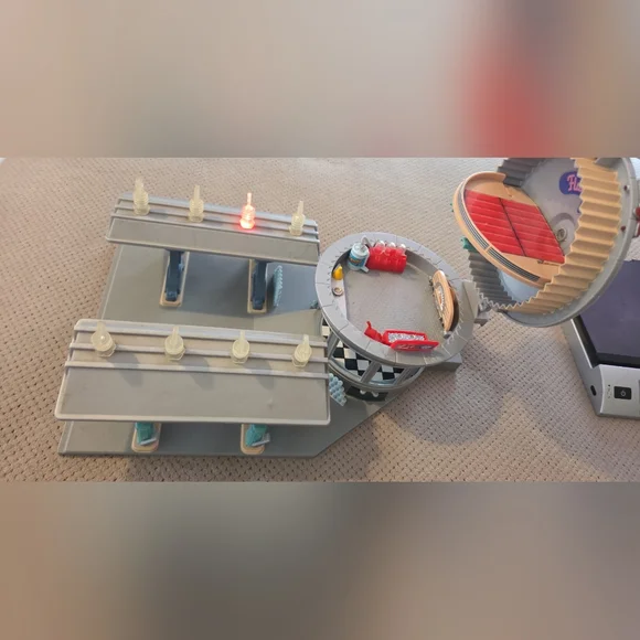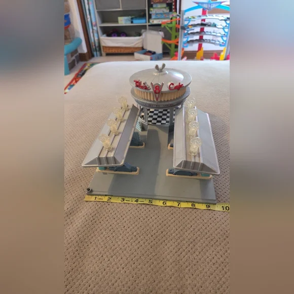 Disney Pixar Cars Flos V8 Cafe Playset w/ Flashing Lights Radiator Springs Mater. Preowned. No battery cover.