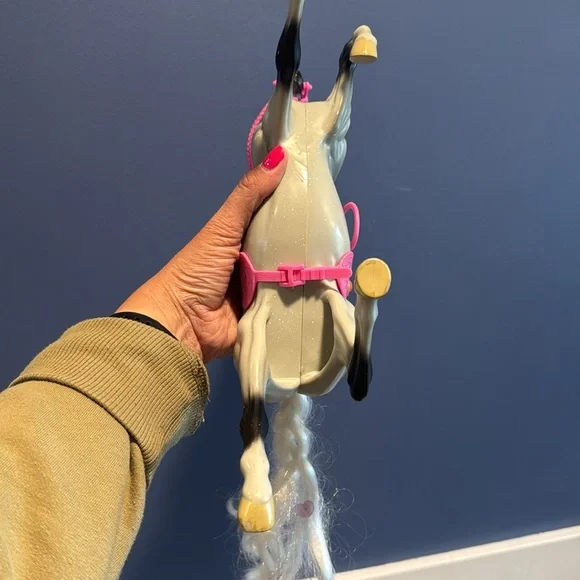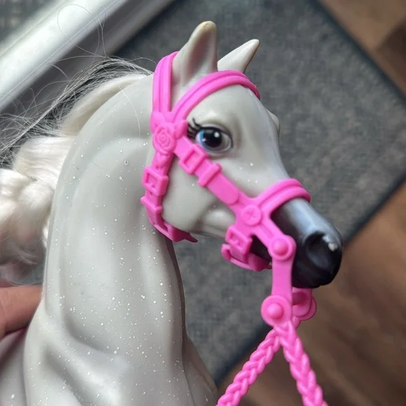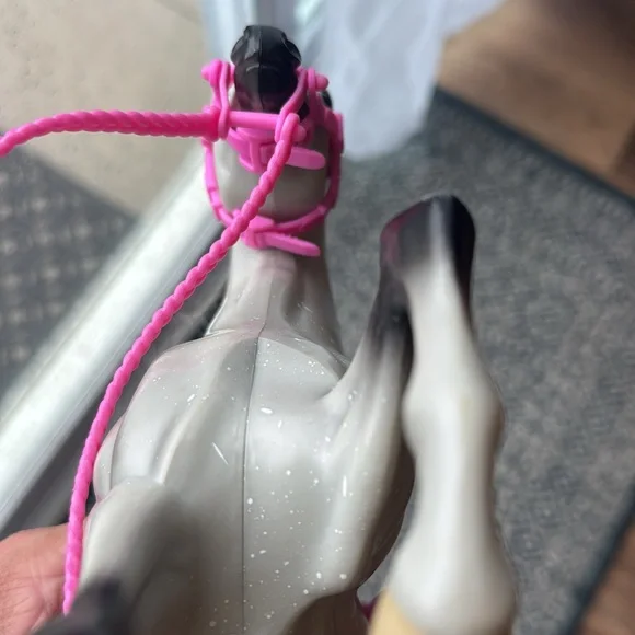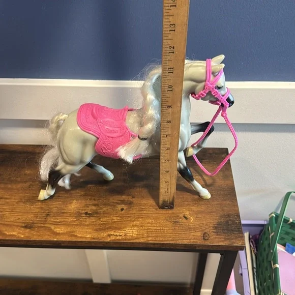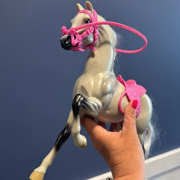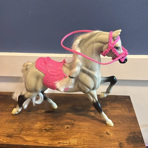 Gray toy horse featuring a vibrant pink saddle and bridle. Perfect for imaginative play.