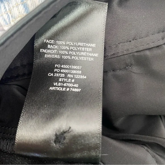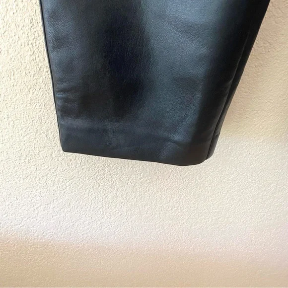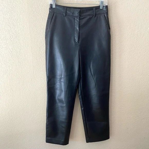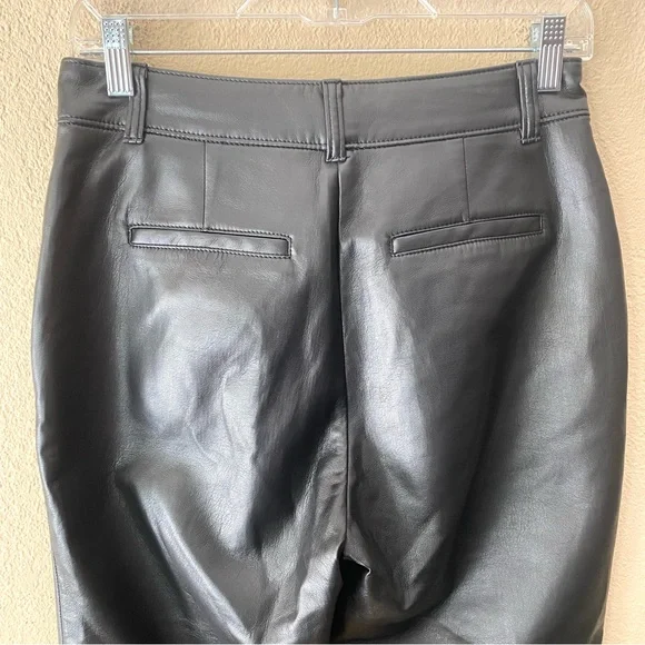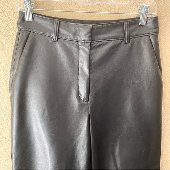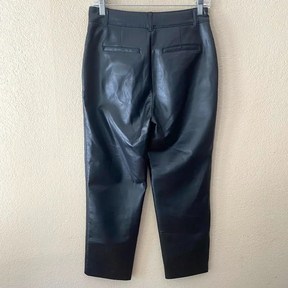 These are classic-fit mid-rise trousers with a straight cropped leg and slash hand pockets. Super soft vegan leatherBack welt pocketsDarted back waist for shapingZip fly with hook-and-bar closureContent: 100% polyurethane; Interior: 100% polyester Care: Machine washApprox 14.25” across front waist, 11” rise, 26” inseam Excellent used condition