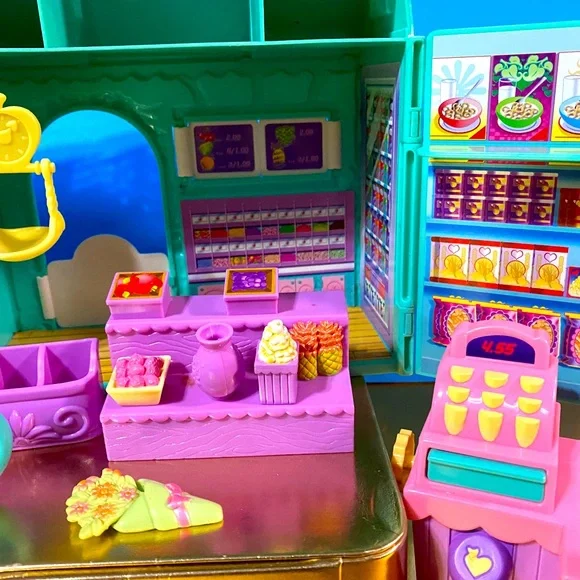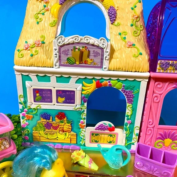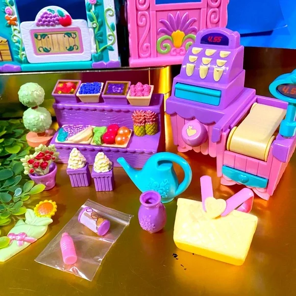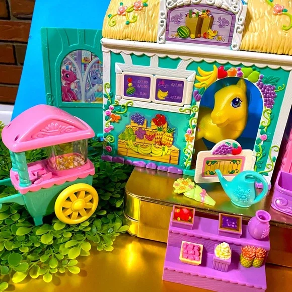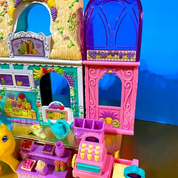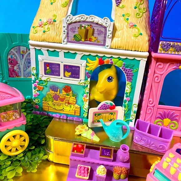 My Little Pony G3 Vintage 2003 Collectable Bloomin’ Blossom Shop Magnetic Playset Features Can Be Activated by Any Magnetic My Little Pony Figure NEW Condition Includes MEADOWBROOKYellow Pony w/Purple & Blue Hair, Cash Register w/Conveyor Belt, When MEADOWBROOK Touches The Cash Register, It Opens, Turn Knob On The Conveyor Belt To Make Food Drop, 1 Containers Of Fruit, Vase, Bouquet Holder, 1 Bouquets, Watering Can, Fruit Stand, Popcorn Stand Roll the cart and Popcorn pops, 1 Bag of Popcorn, purple 3 Compartment Flower HolderRARE FIND
