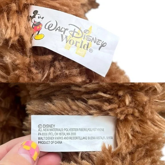 Disney Tan Hidden Mickey Face Pre Duffy Shaggy Plush Teddy Bear Disney World 17”•Classic, plush, shaggy, Disney, fuzzy, cozy, collectible, vintage, retro, teddy bear •Long pile faux fur teddy bear, light brown, tan•Embroidered hidden Mickey Mouse face on paw pads and on tush•Material and logo tags attached •Disney World Park Merchandise•Pre-Duffy Bear•Missing original hang tag and mini book•Measures 17 inches tall standing, 10.5 inches wide, 11 inches sitting•Teddy is in great pre-owned condition; small rip on one paw pictured •Collectible Disney item!