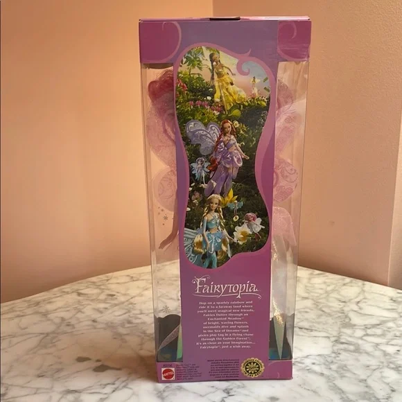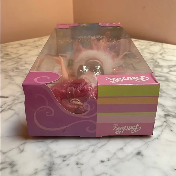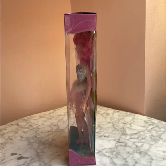 Barbie Fairytopia doll featuring vibrant pink hair and a sparkling silver outfit. Perfect for imaginative play. See photos for box condition.