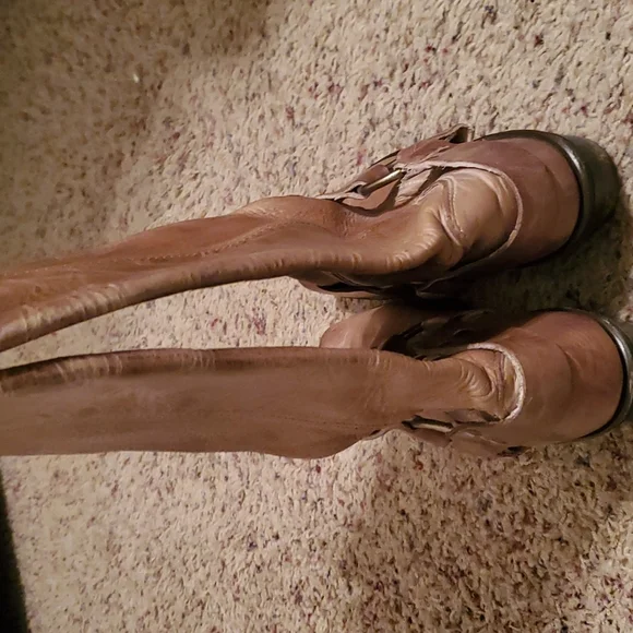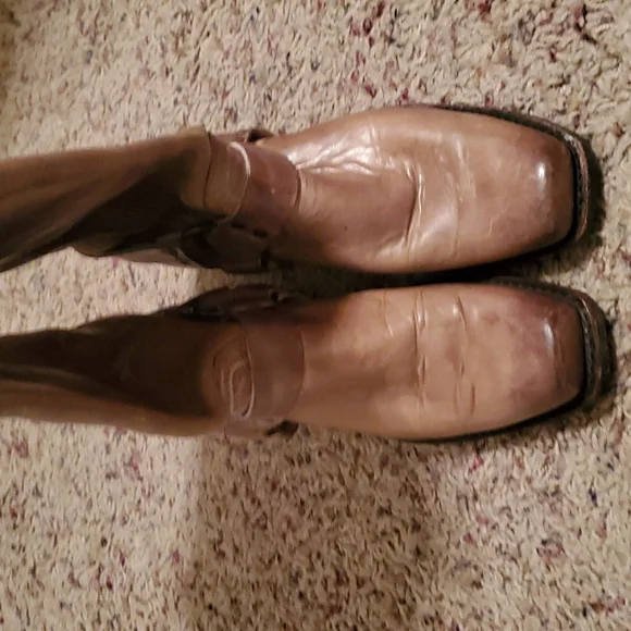 FRYE BOOTS DISTRESSED TAN LEATHER HIGH CALF BOOT GREAT CONDITION LIGHTLY WORN SIZE 7.5 MEN´S I WORE THEM AS A WOMAN FIT 8.5-9 WOMEN