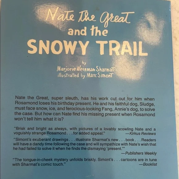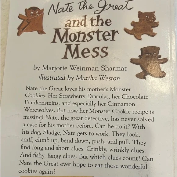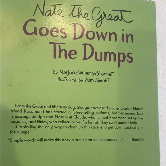 Vintage Nate the Great accelerated reader AR Children´s Book Set popular chapter books for beginning readersThese books feature a young detective named Nate who solves mysteries with his dog, SludgeThe series is known for its engaging storylines, quirky characters, & focus on problem-solving, making it a hit with young readersThese books are part of the Accelerated Reader (AR) program for children, reading on a second grade level. The program helps track reading progress & comprehensionThe books include the following titles including some first edition books: Nate the Great hardcover 1972 copyright, Nate Goes Down in the Dumps," "Nate the Great and the Big Sniff," "Nate in the case of the fleeing fang”, meet the great and the snowy trail, Nate the Great and the Monster Mess," "Nate the Great Saves the King of Sweden," hardcover 1992 copyright and "Nate the Great and the Stolen Base” hardcover 1992 copyrightThe books are typically under 50 pages long & are suitable for children in early elementary gradesThe "Nate the Great" series was created by Marjorie Weinman Sharmat & illustrated by Marc SimontThe series has been popular for over 40 years & are considered groundbreaking children´s novelsThe books encourage children to think logically and solve mysteries alongside Nate, making them an excellent choice for young readers learning to readSmoke free businessGet this Set of Nate the Great children´s books Including various titles with colorful illustrations