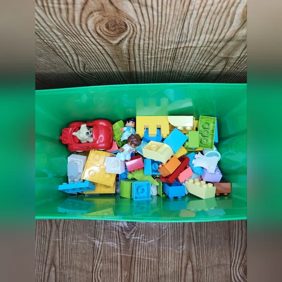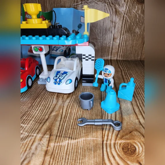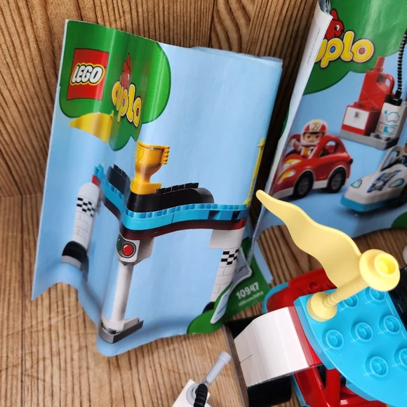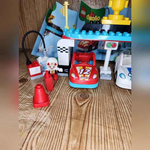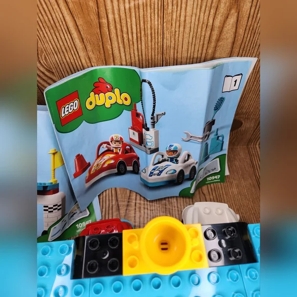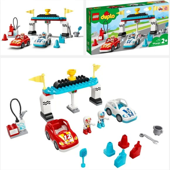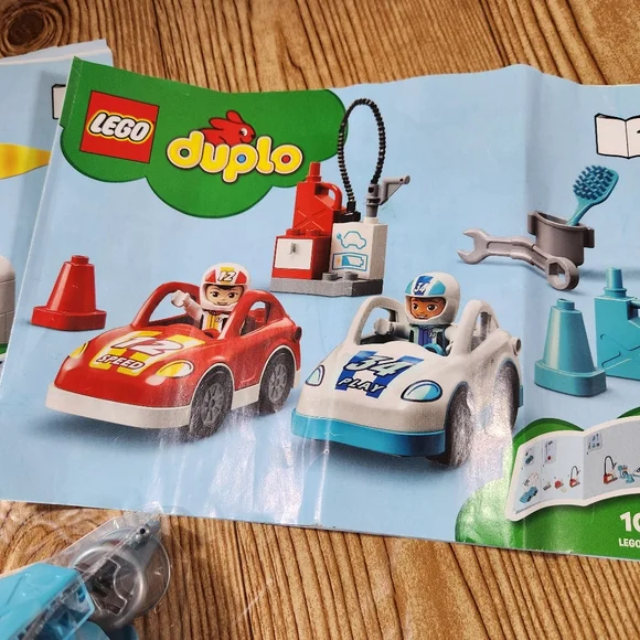 DUPLO Race Cars 10947 Set with Brick Box.Lot includes:- Complete Race Cars Set with Instructions.- Brick Box with 80+ additional legos.