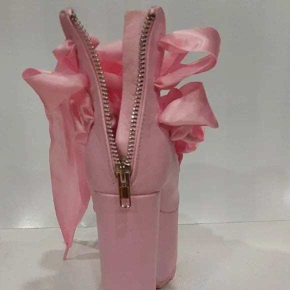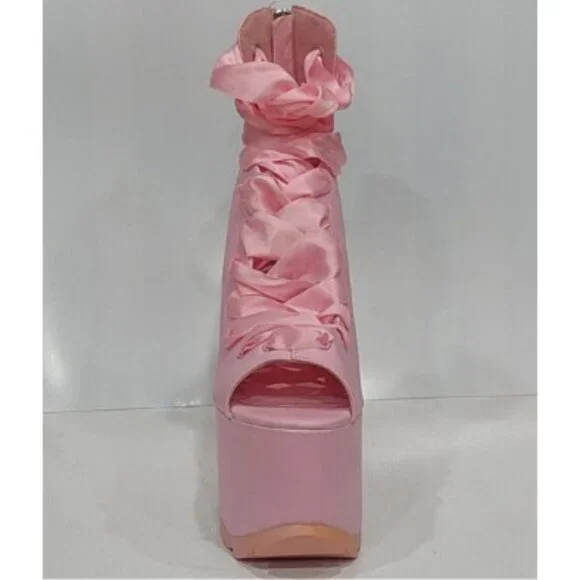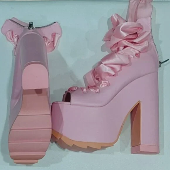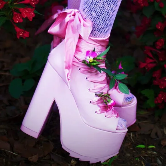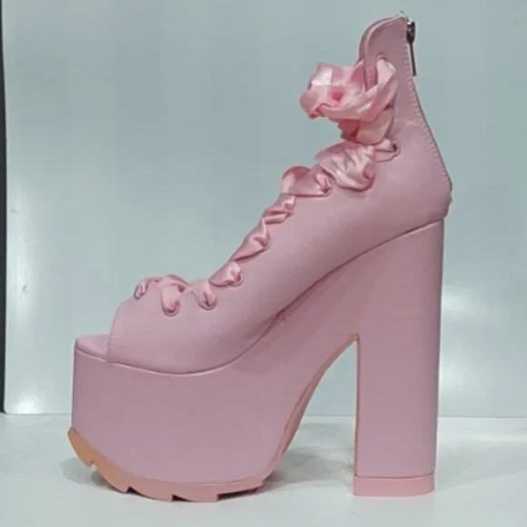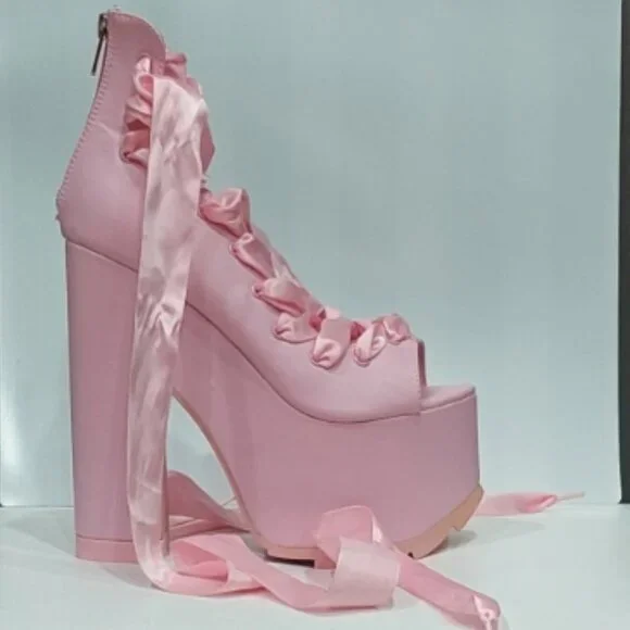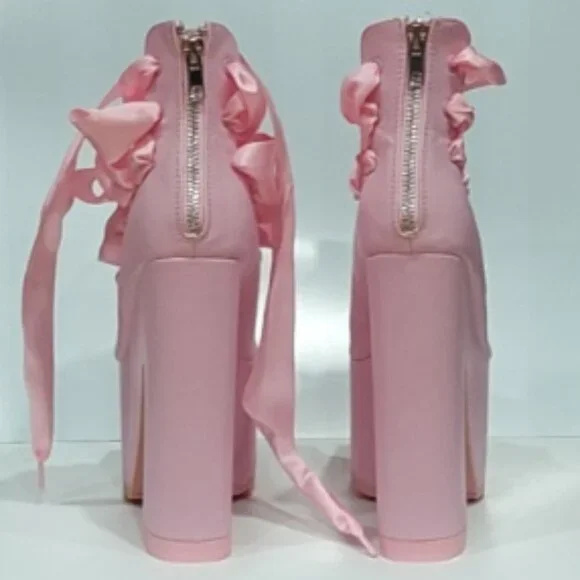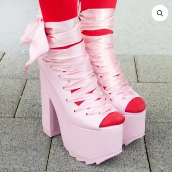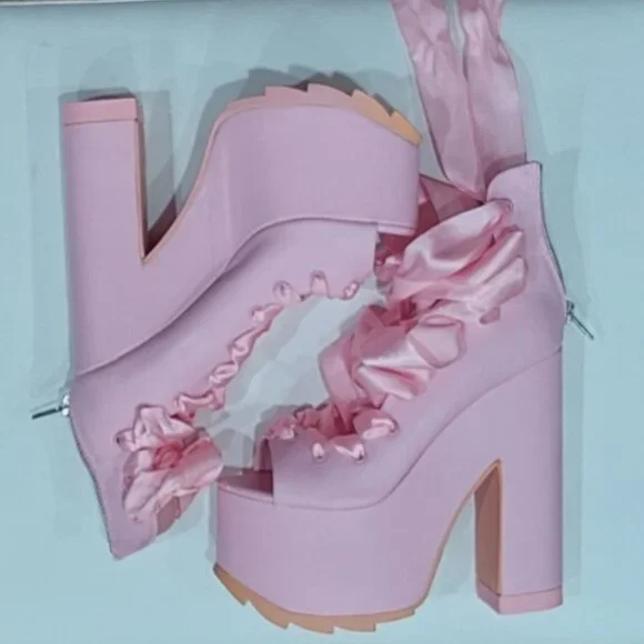 RARE FIND! Those stunners are exclusively from Y.R.U. x Dolls Kill collaborative collection. An absolutely beautiful statement shoe with so much personality and style! It´s romantically girly and edgy-chic at the same time. Made from high-quality vegan leather upper, lining, and insoles. It comes in gorgeous Pink that adds a perfect touch of color to any outfit. Features surprisingly comfy 6.25" sky-high heels and 3" platform, gorgeous ballet-inspired wide satin laced ribbons from toes to ankles in matching Pink, comfortable and soft cushioned footbed, vegan leather lining with some sight of wear non-visoble from outside, and convenient easy access zippers in the back. It´s one of those timeless hot shoes that will elevate any look and take it to the next fashion level. True to size 7. Comes from a clean, smoke-free home.