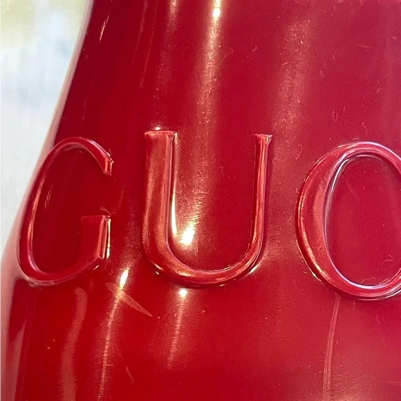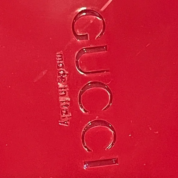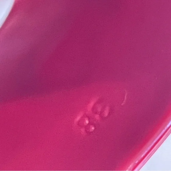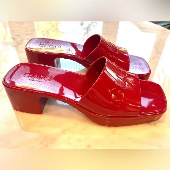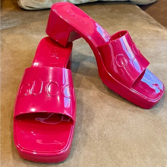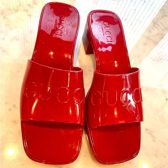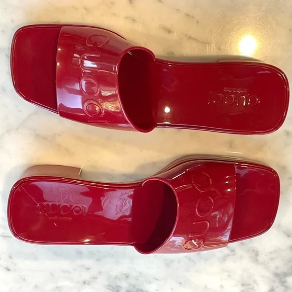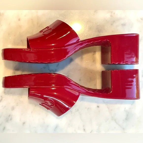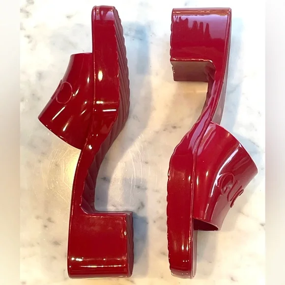 ’s fabulous, fun rubber slides. I know the thought of rubber shoes is a tough one to grasp, but boy am I a convert. These are so comfortable and so chic. They fit sizes 6.5- 7.5 because the top part grips your foot comfortably— so your feet stay in, even if they’re smaller. They’re a darker, lipstick red, not pinky. Chunky 2” heel, embossed logo. These are almost new, a tiny smudge up near the (pictured) but otherwise glossy, gorgeous and wildly practical. Hose them off when they dirty!