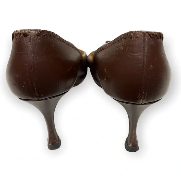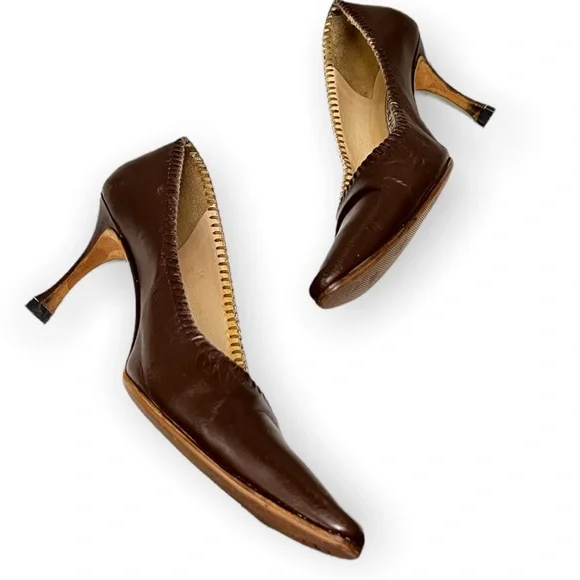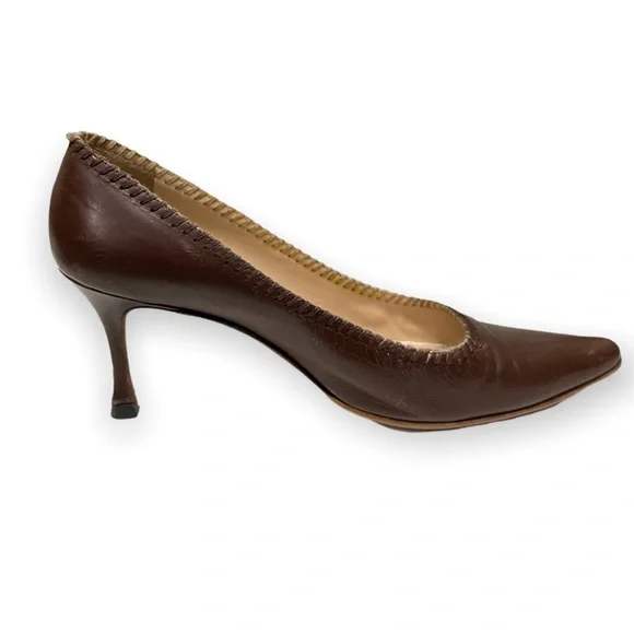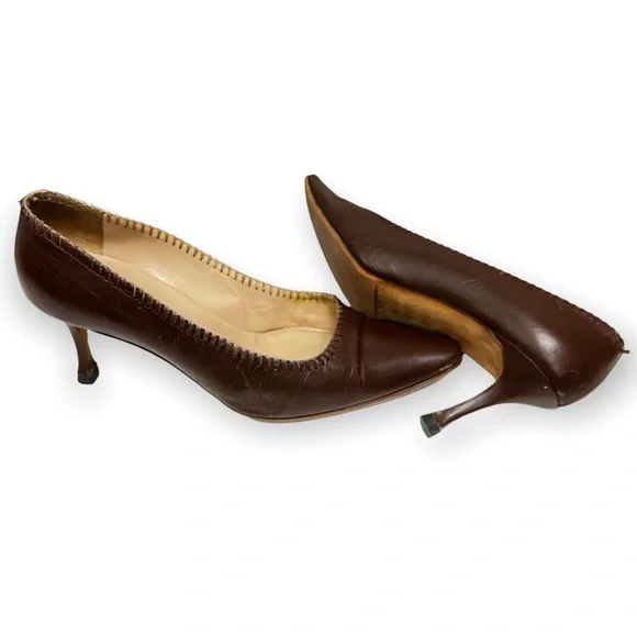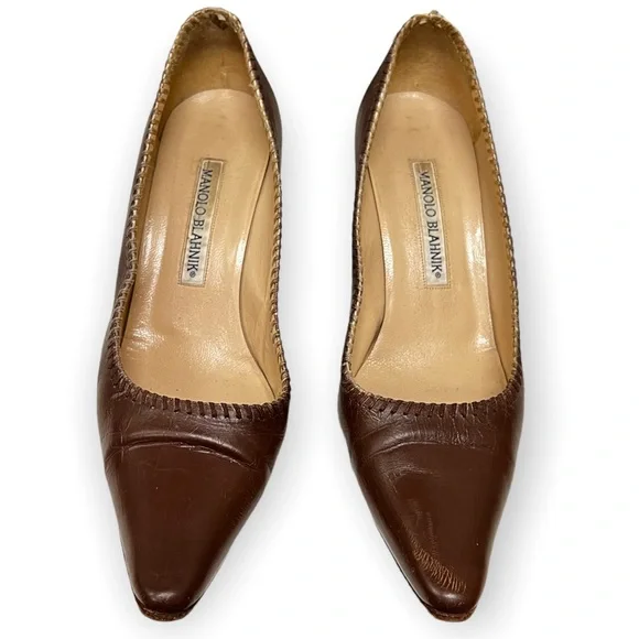 Reposhing this item I purchased from @roadthrift. Loved it, but need different size.Manolo Blahnik leather kitten heel pointy toe shoes. ●Size 37.5●Heel height 3"●Color us brown **sole has been repaired ** Ink stain**Creases from wearPlease forward any questions about this item!