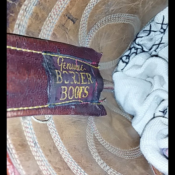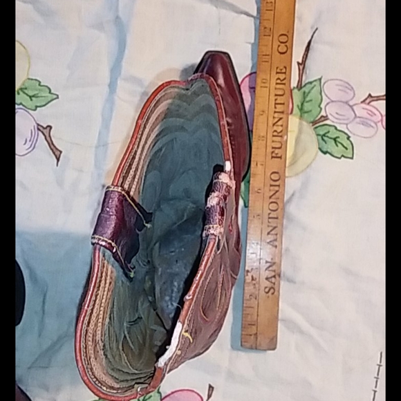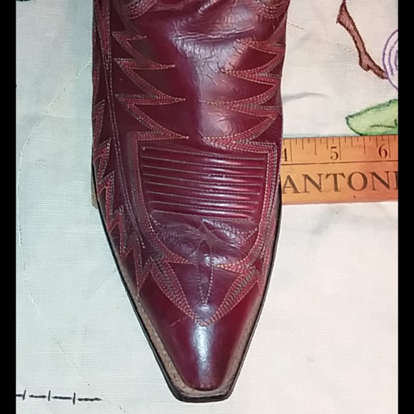Great pair of Cranberry red vintage cowboy boots. Wingfoot Genuine Border Leather Boots. Nice stitching. Good condition with some wear. See photos. Not sure of the size. I would guess about a Women´s 6- 7. See measurements in photos.