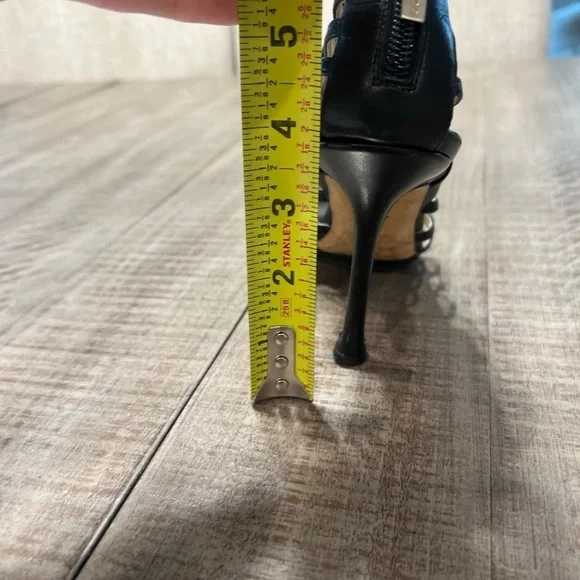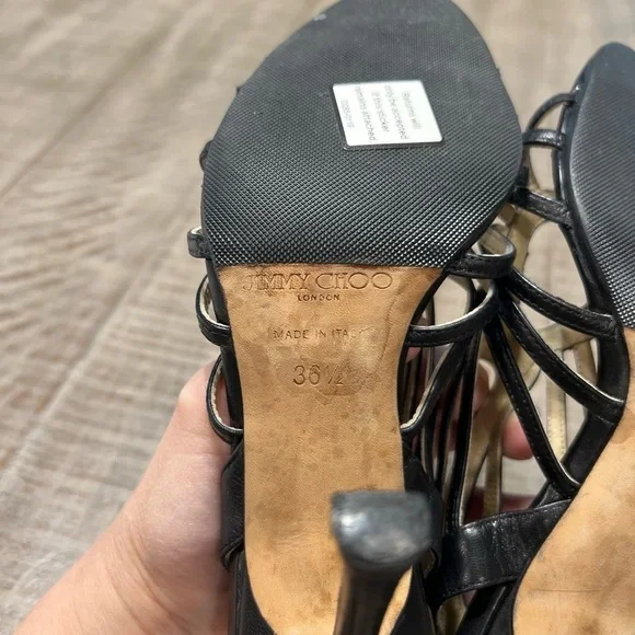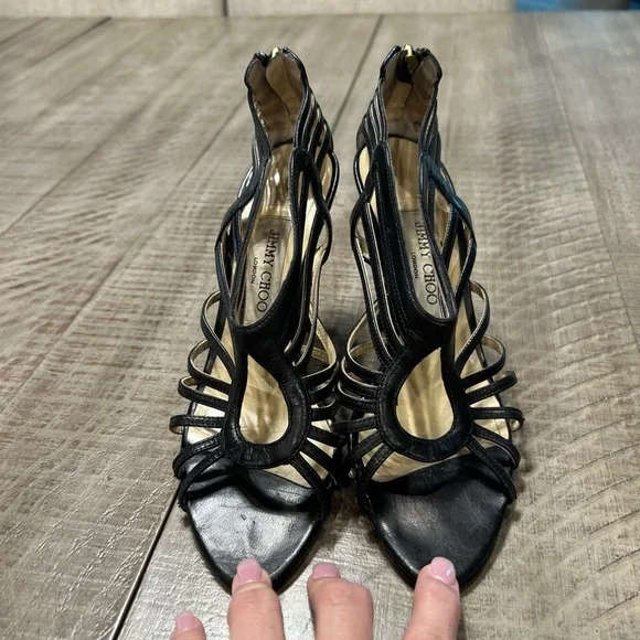 Elevate your shoe game with these stunning Jimmy Choo Samoa Leather Cut Out Cage Heels Sandals in size 38.5 (US 8.5). The strappy design and open toe make them perfect for any occasion, while the high stiletto heel adds a touch of elegance and sophistication. Made with premium leather and featuring a unique cut-out design, these heels are sure to turn heads. The black color complements any outfit, making them a versatile addition to your shoe collection. Perfect for women who want to make a statement, these heels are a must-have for any fashion-forward wardrobe.The heel tap on left shoe has signs of wear …only making the shoe lean to one side a little. The heels themselves are clean clean. Small scuff on toe as shown in picture.
