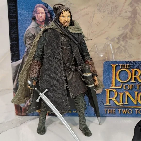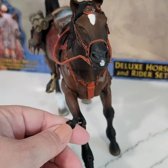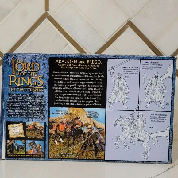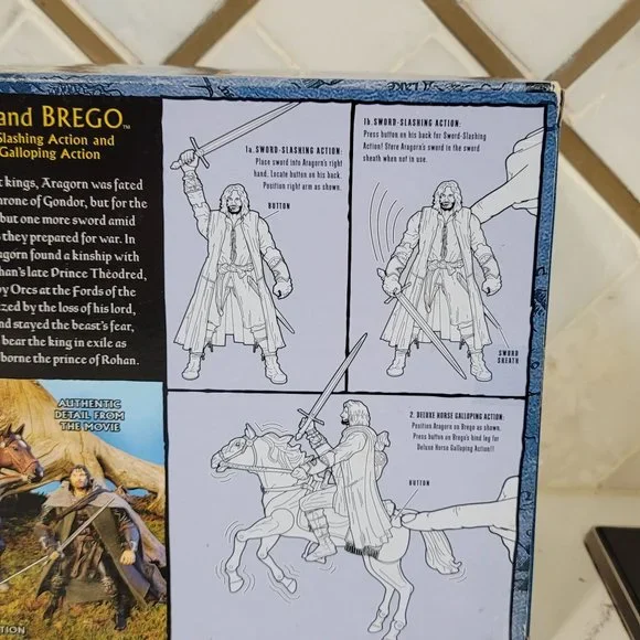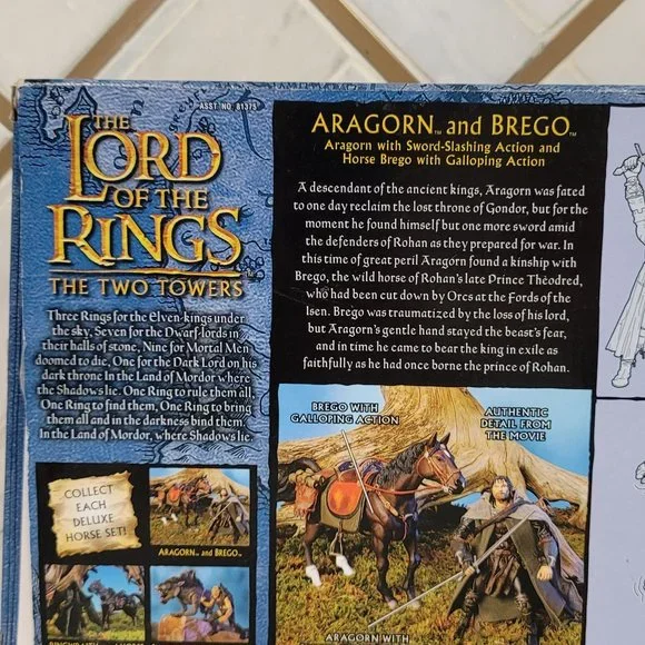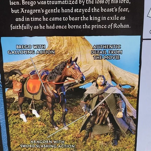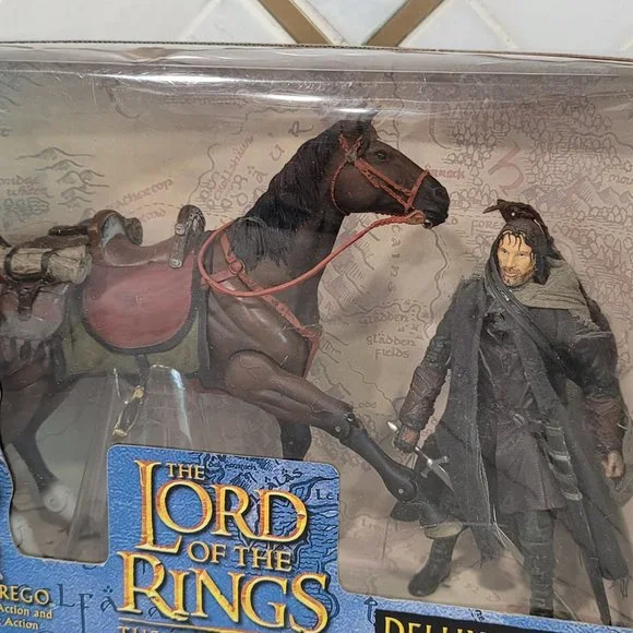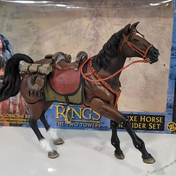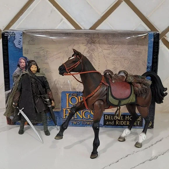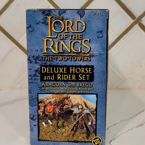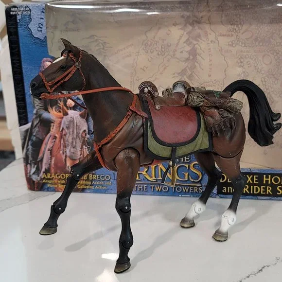 Recreate epic scenes from The Lord of the Rings with the TOYBIZ Aragorn & Brego Deluxe Horse and Rider Set from The 2 Towers. True to character details, this set is perfect for collectors and fans.• Detailed Aragorn figure• Brego horse with articulation• Inspired by The 2 Towers• Great for collectors• Enhances imaginative playthe horses knee has a small chip you can glue back on.Condition: Pre-Owned Good