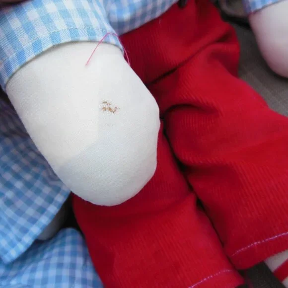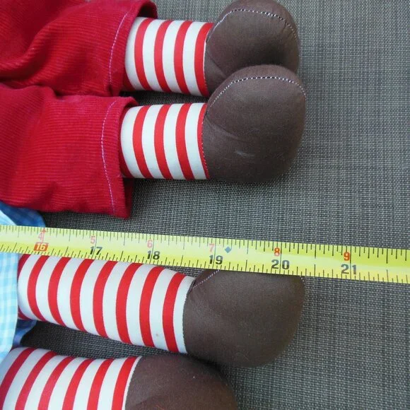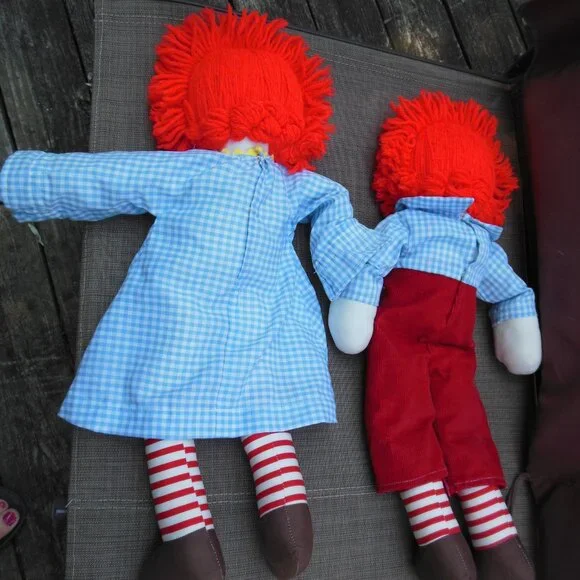 Raggedy Ann and Andy Pair of handmade dolls set of 2 great condition circa 1970sadorable handmade vintage stuffed dollsRaggedy Ann and Raggedy Andy are both carefully and skillfully handmadered yarn hairbutton eyesembroidered faceshandmade body and clothesAnn has snap-on dress with rick rack on the front of her gingham dressAndy has snap-on outfit with corduroy pantseach measures approximately 20"x6"very good to excellent preowned stored and used vintage condition - circa 1970s - please see photos - couple very small stains from age noted, not very noticeableGold Room