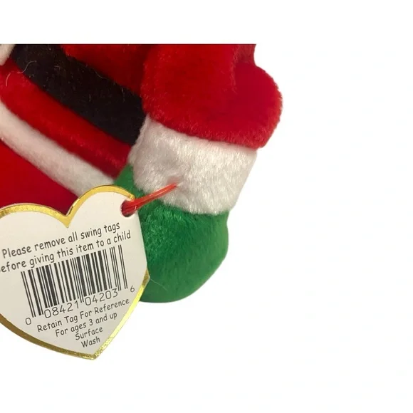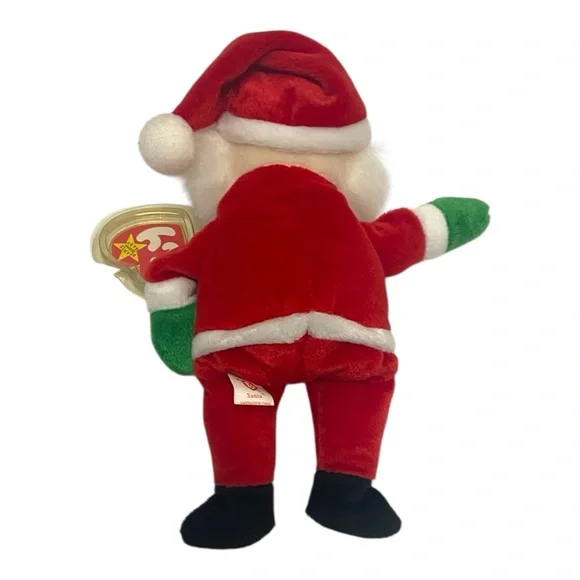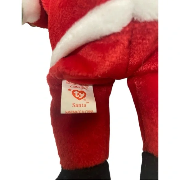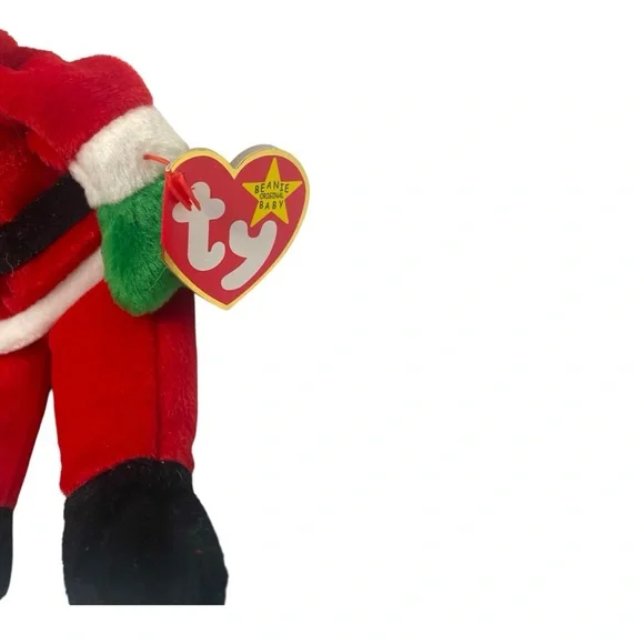 The product is a Ty Beanie Baby named Santa, specifically released for Christmas in 1998. This collectible plush toy comes with its original tags, adding to its appeal for collectors of Beanie Babies. With the brand being Ty and the year being 1998, this Santa Beanie Baby is a sought-after item for fans of the original Beanie Babies line. Additionally, the product offers free shipping, making it a convenient option for purchasing this retired Beanie Baby for a Christmas-themed collection.Tag holder is discolored, but it has keep tag in pristine condition.