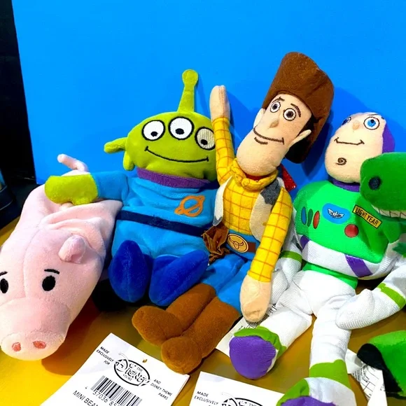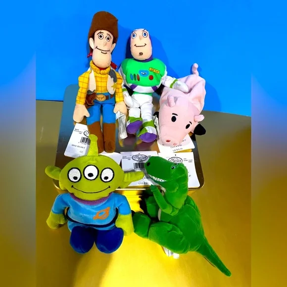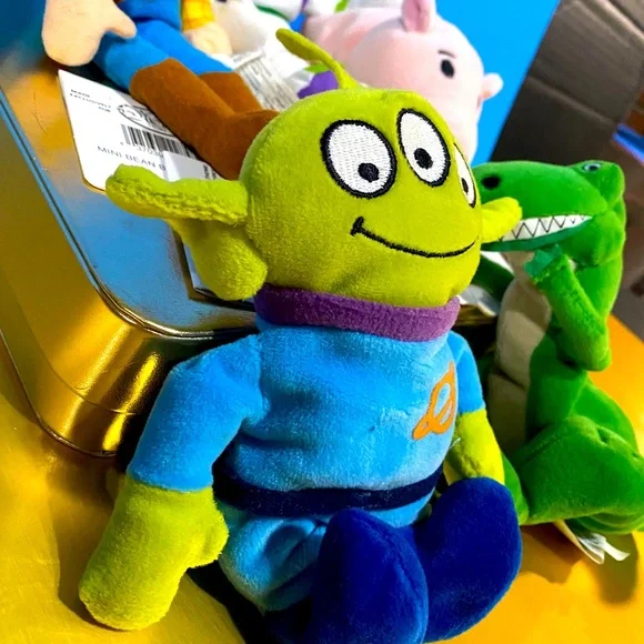 Disney Store NWT Vintage 1990’s Collectible Original Toy Story Bean Bag Plush Complete Set Of 5 with Original Tags, All Have Embroidered Face, Includes ALIEN Green & Blue 3 Eyed...