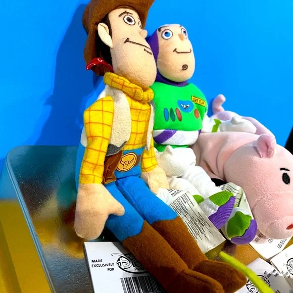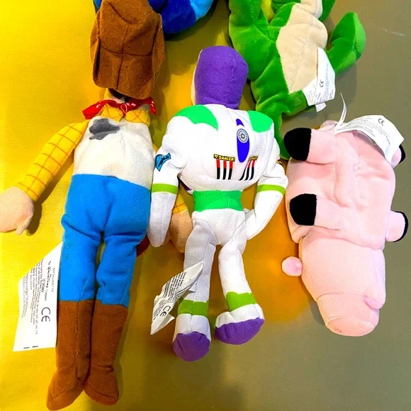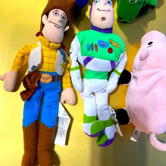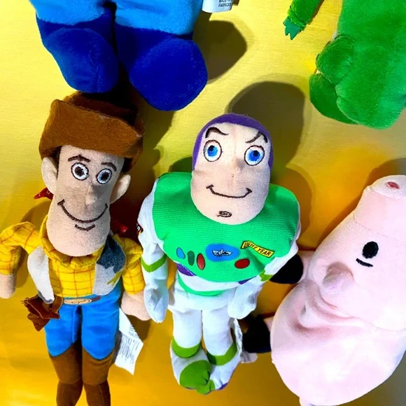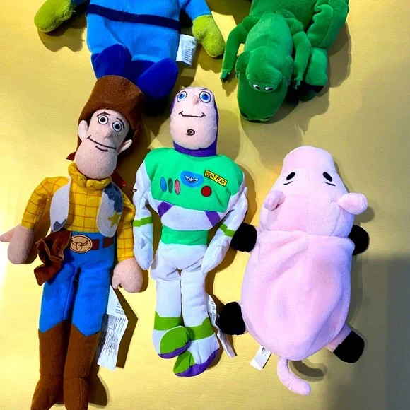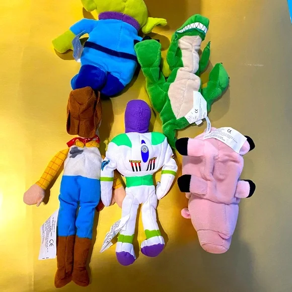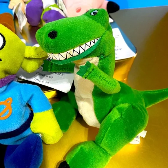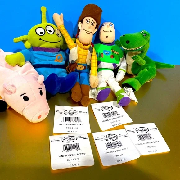Disney Store NWT Vintage 1990’s Collectible Original Toy Story Bean Bag Plush Complete Set Of 5 with Original Tags, All Have Embroidered Face, Includes ALIEN Green & Blue 3 Eyed Alien, REX Green Dinosaur, BUZZ LIGHTYEAR The Astronaut, WOODY The Cowboy, HAMM The Pig, NEW VINTAGE CONDITION Except Tags are detached, May have minor blemishes, Sizes Vary 8”-9”